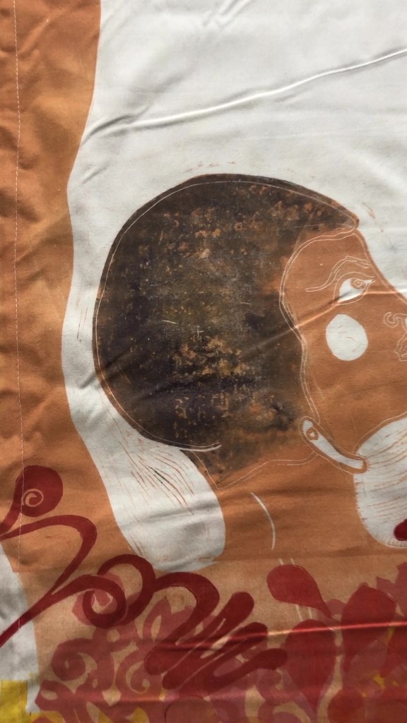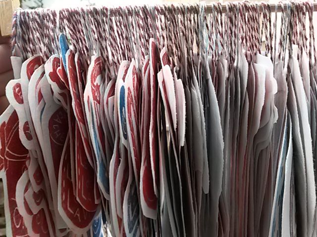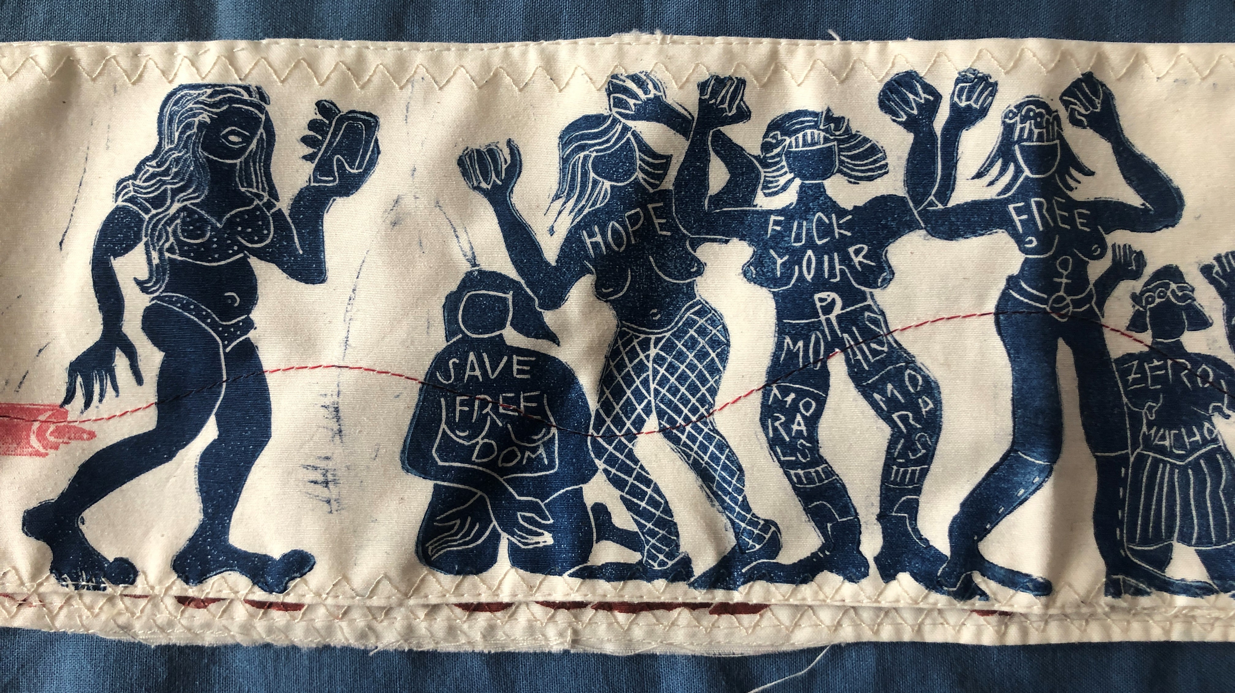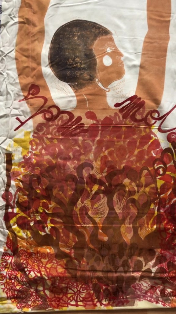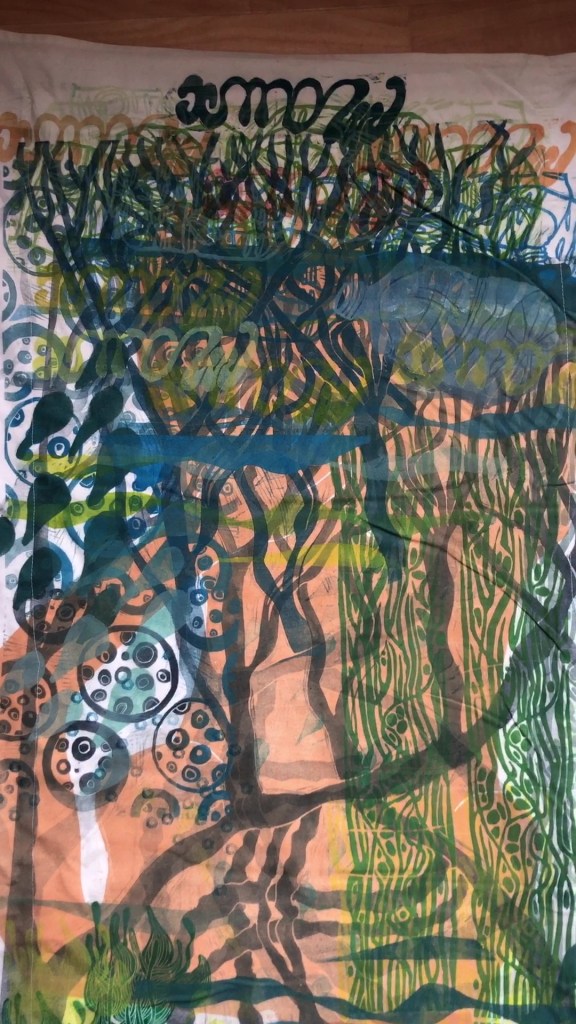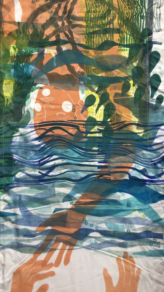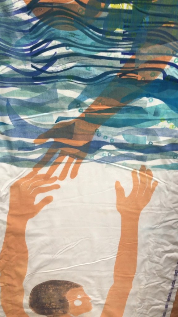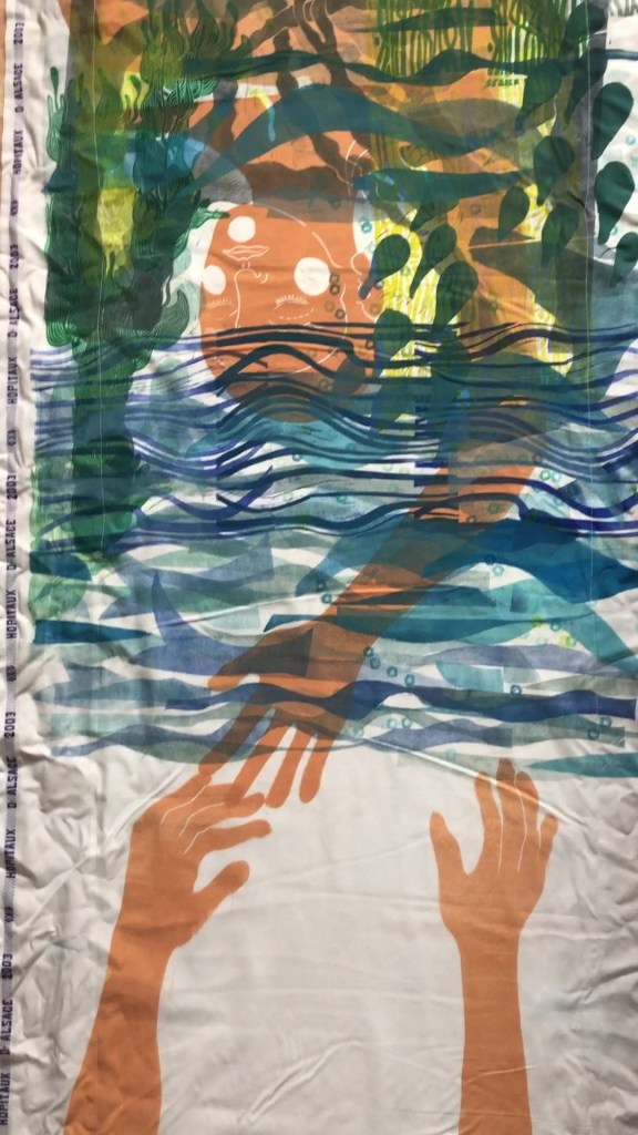 Les larmes forment rivières. Se parler, s’écrire, se soutenir … gestes vitaux. (drap d’hôpital, 280 cm)