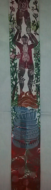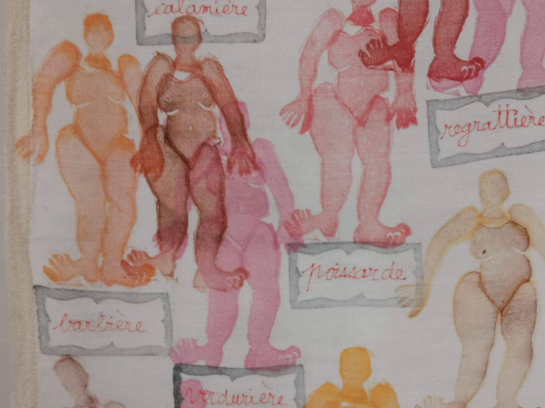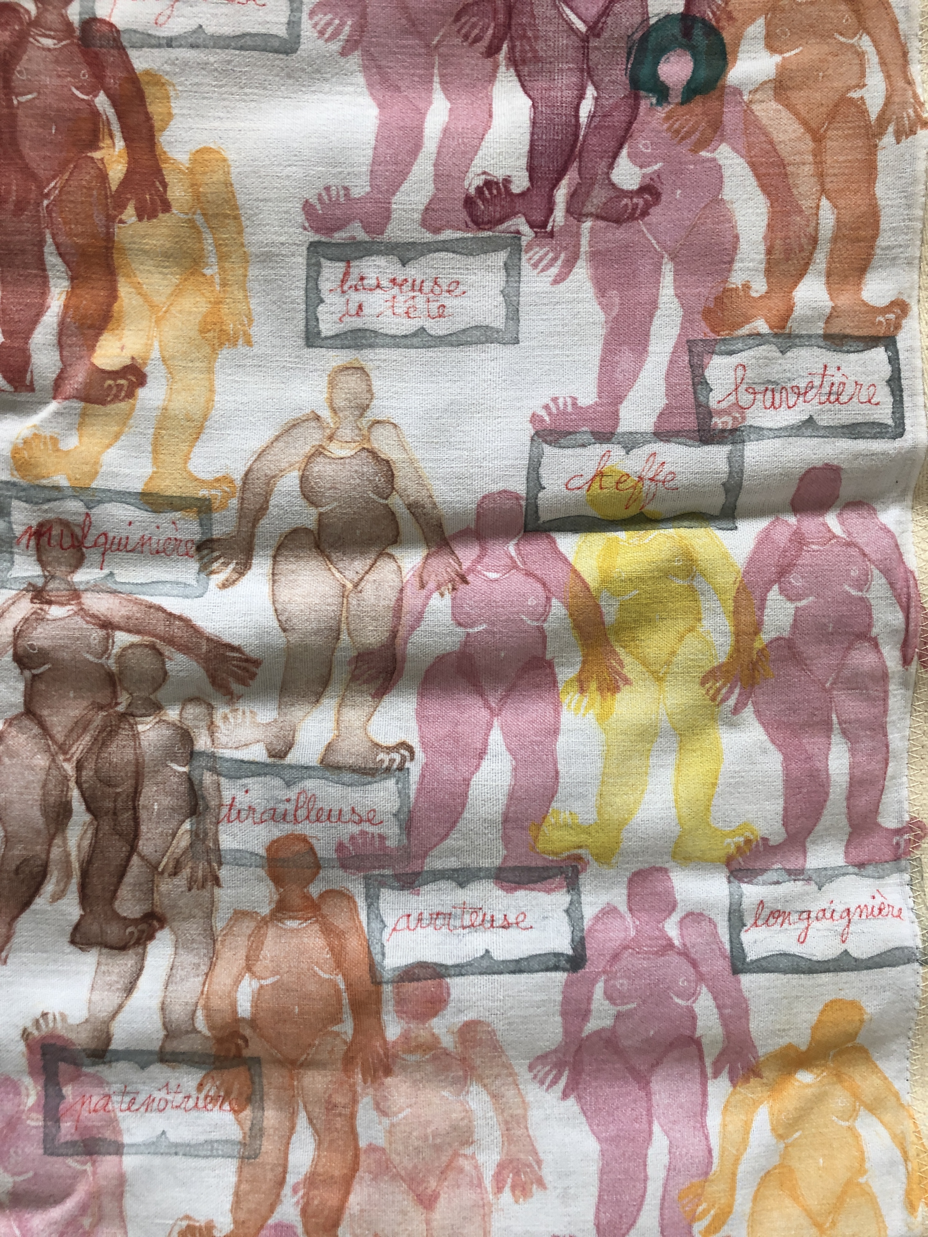 Nombre de métiers -au féminin- cités sur le kakemono « la bonne farce » étaient en usage, du Moyen-Age à la Révolution française. A Paris, la fileresse travaillait la soie (et ce fût un temps un monopole) et la femme-sole était une commerçante indépendante (non assujettie à l’activité de son époux) . La ventrière coupait le cordon ombilical, parmi les matrones, alleresses ou accoucheuses. La bourrelle était la femme du bourreau et l’aidait dans ses tâches. La boursière dans une communauté religieuse tenait les comptes. Au XVII , dans la rue, la regrattière vendait les restes alimentaires (dont de fromages) issus des grandes maisons, la friturière de la friture de poissons, la poissarde du poisson frais et la verdurière, des légumes. Fin XIX, un typographe tenta de faire embaucher sa femme, typote, dans son imprimerie : refus du syndicat des typographes (« pas de femme dans ce métier« ). Bien sûr, quelques métiers fantaisistes ont été ajoutés à cette liste non exhaustive …