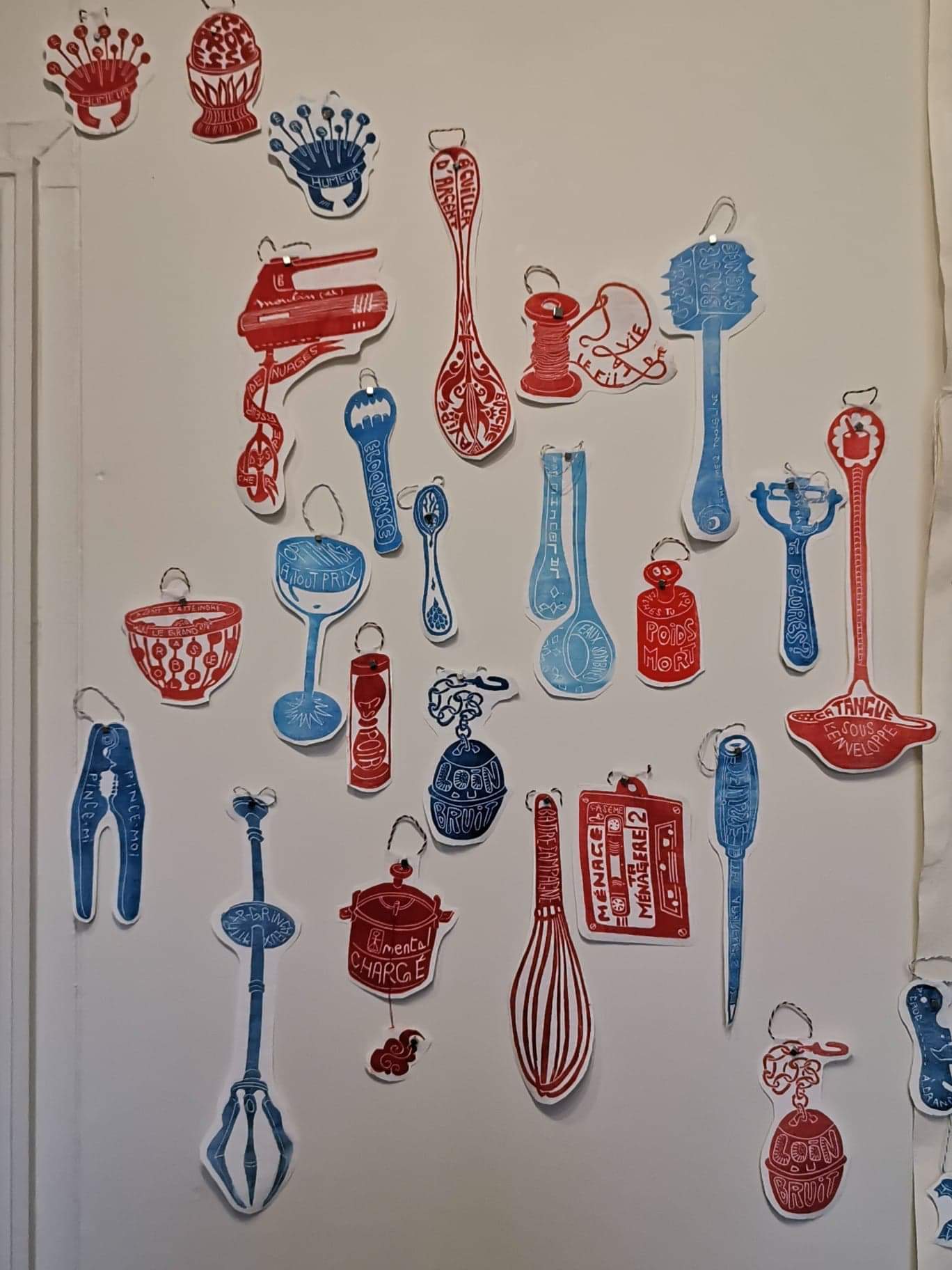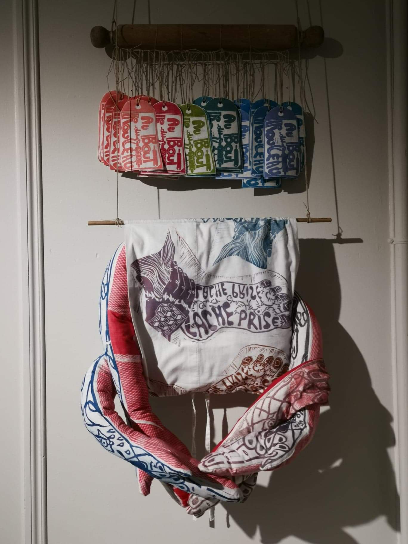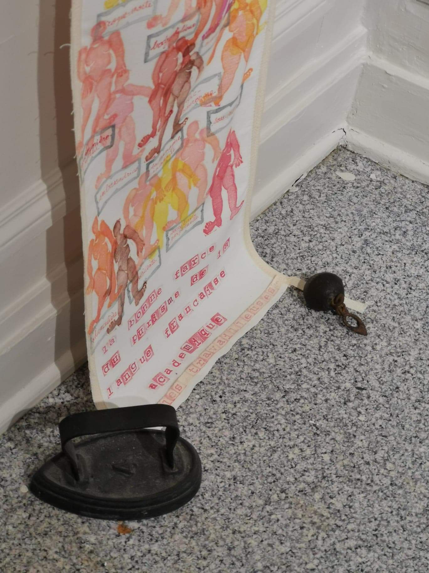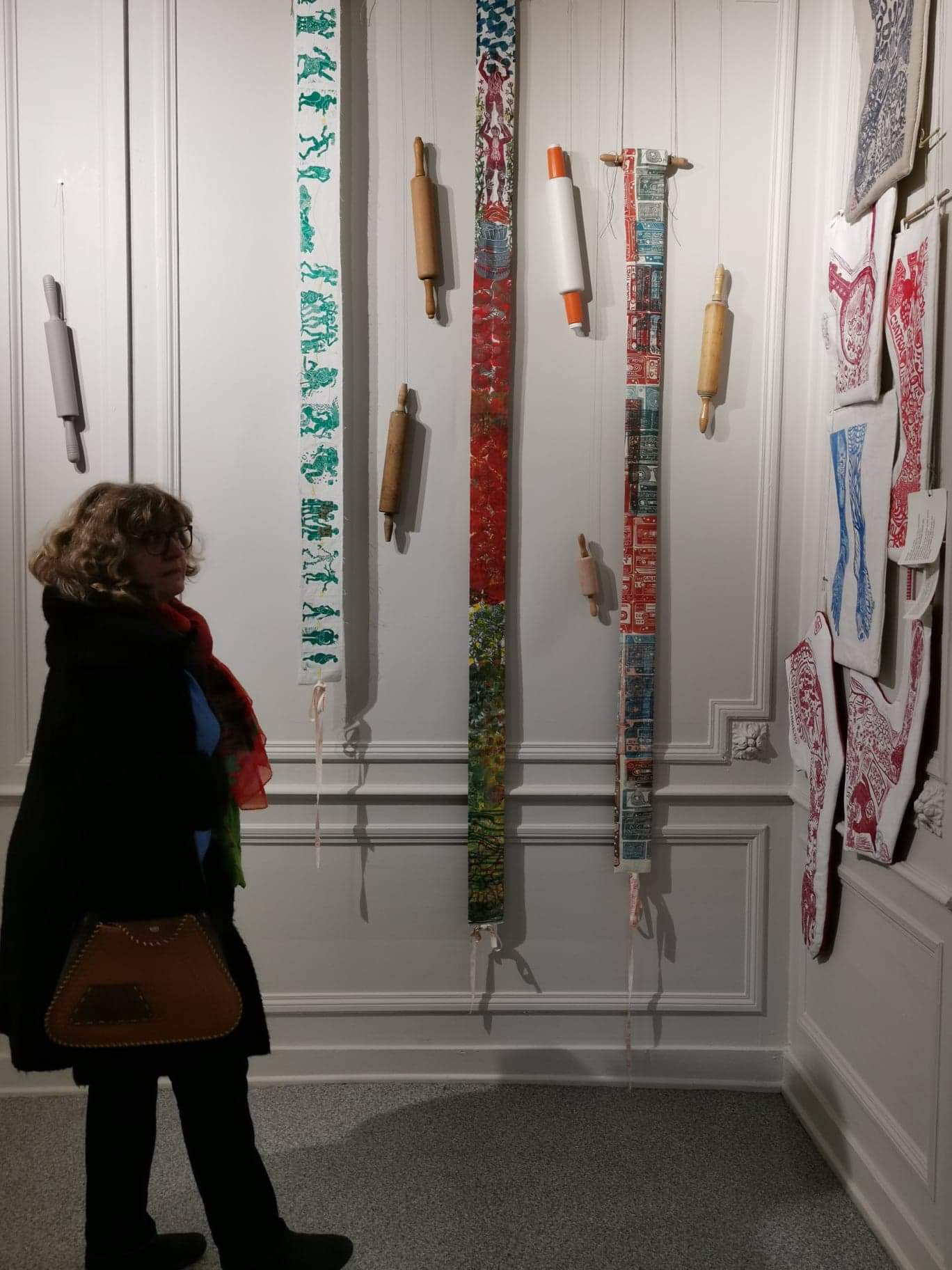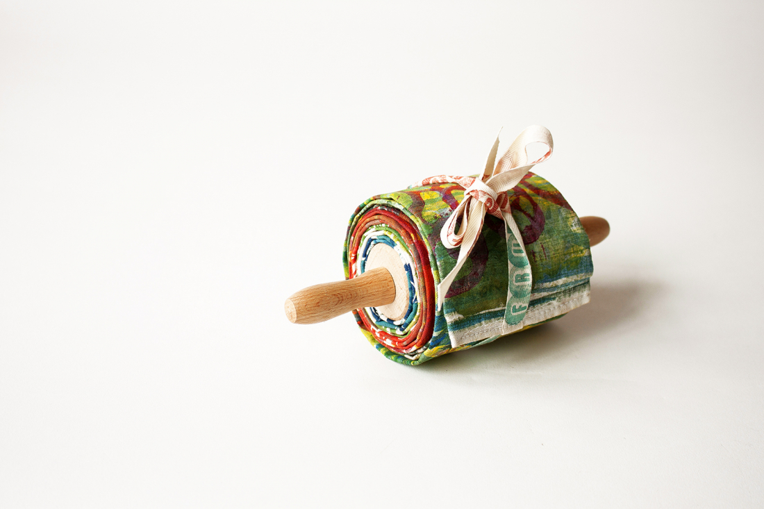 Au bout du rouleau évoque l’épuisement. Cette fatigue que l’on éprouve parfois en tant que femme, mère, artiste, être humain … face aux normes, aux injonctions, à la prédation, à l’intolérance, … C’est aussi un clin d’œil sur l’outil et ses usages : écrasement, relais, embellissement (coiffure, gazon), cuisine, protection (Talmud, des papyrus), performance (surf), pilotage (manche avion), céramique et gravure, …