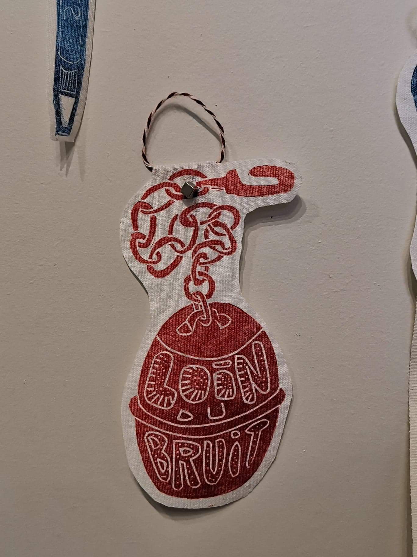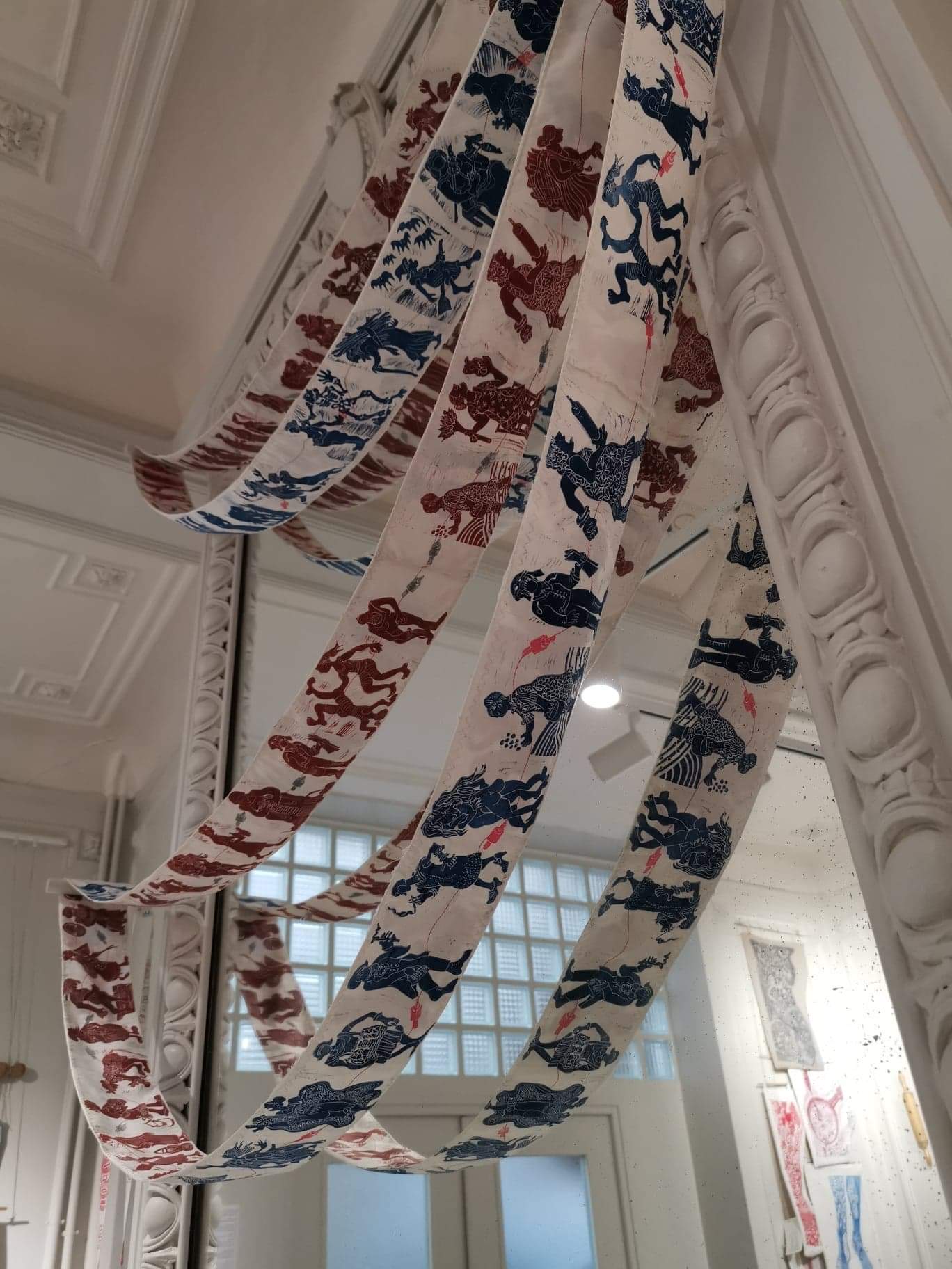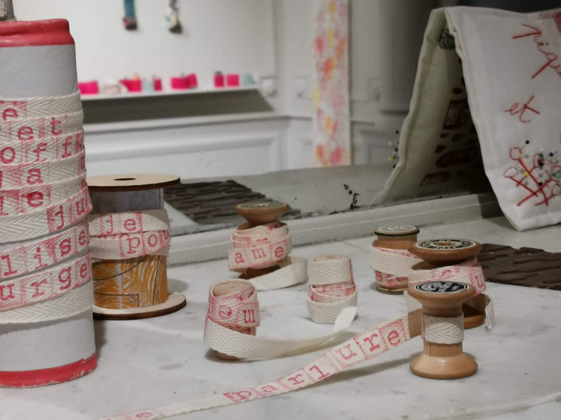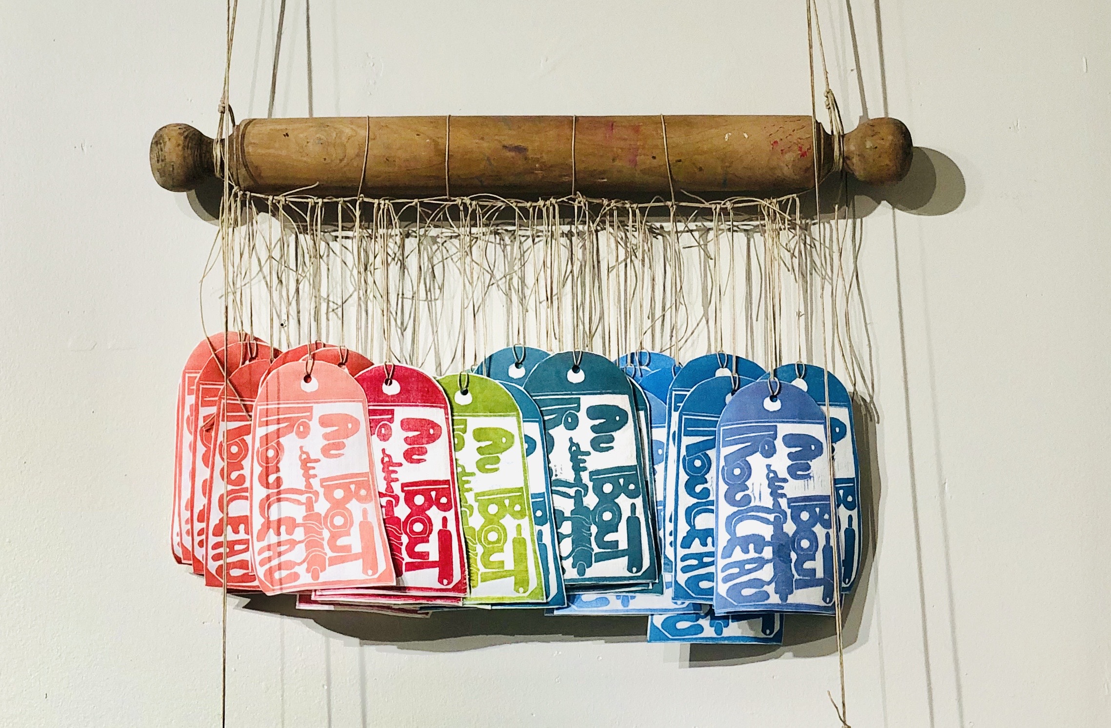 Au bout du rouleau évoque l’épuisement. Cette fatigue que l’on éprouve parfois en tant que femme, mère, artiste, être humain … face aux normes, aux injonctions, à la prédation, à l’intolérance, … C’est aussi un clin d’œil sur l’outil et ses usages : écrasement, relais, embellissement (coiffure, gazon), cuisine, protection (Talmud, des papyrus), performance (surf), pilotage (manche avion), céramique et gravure, …