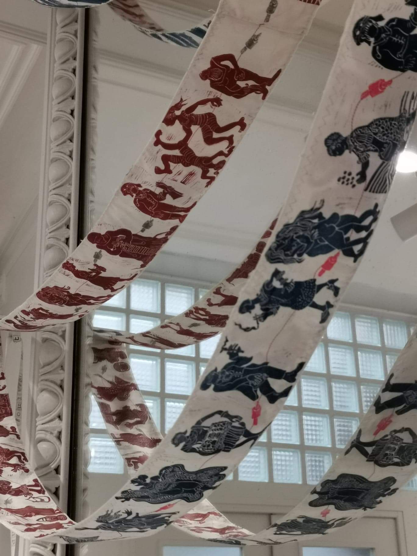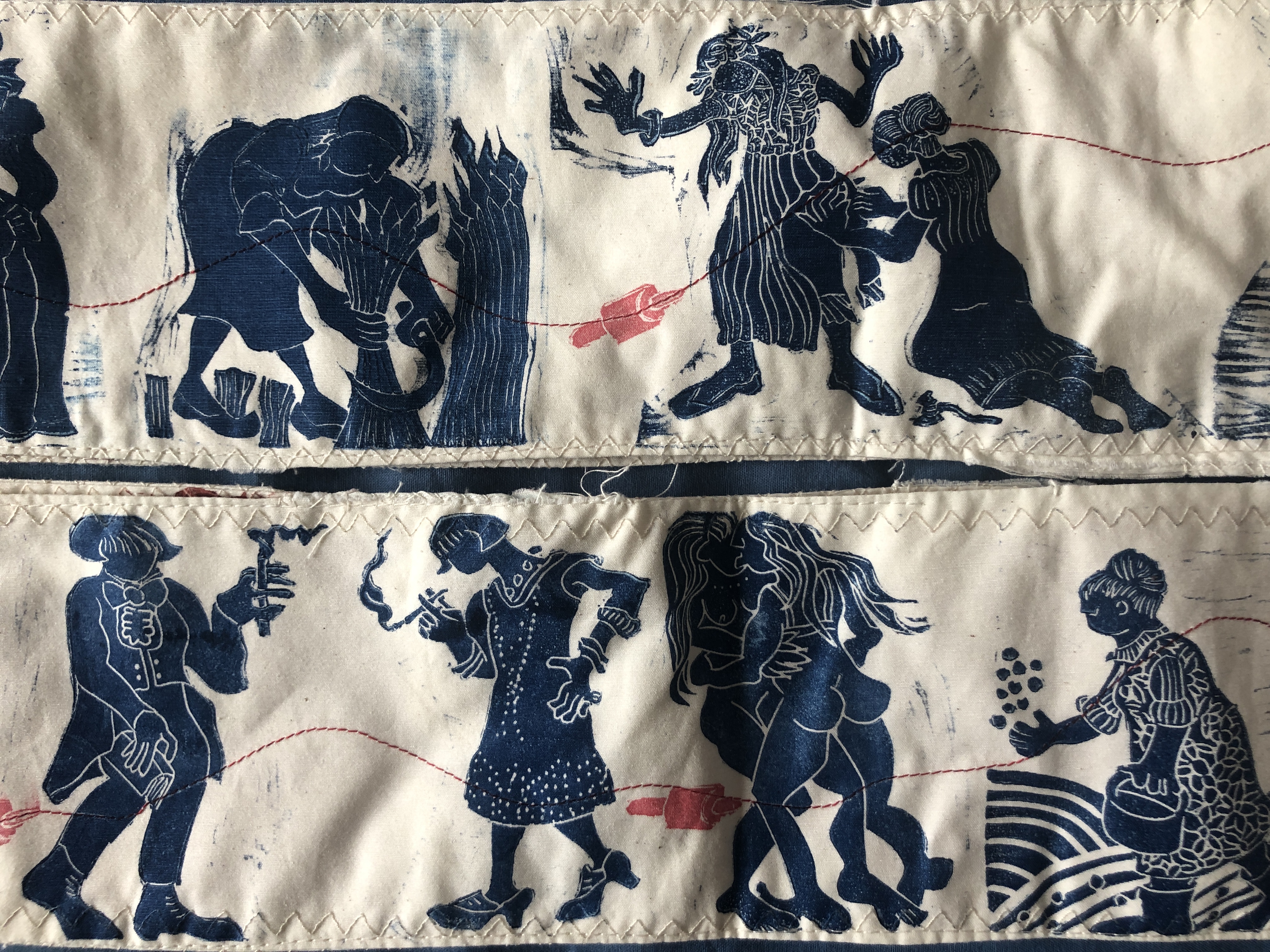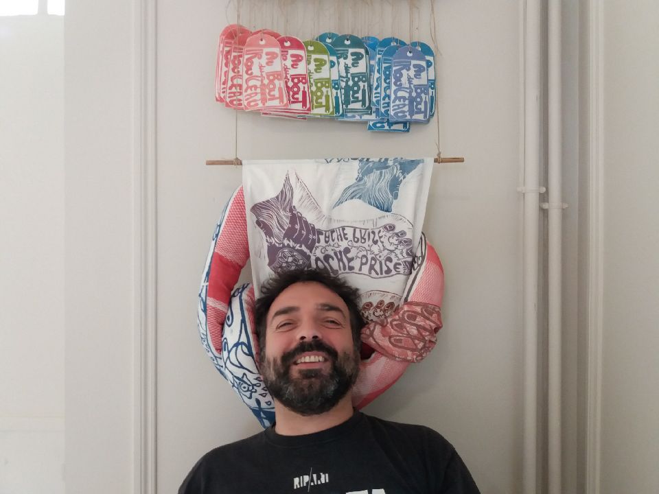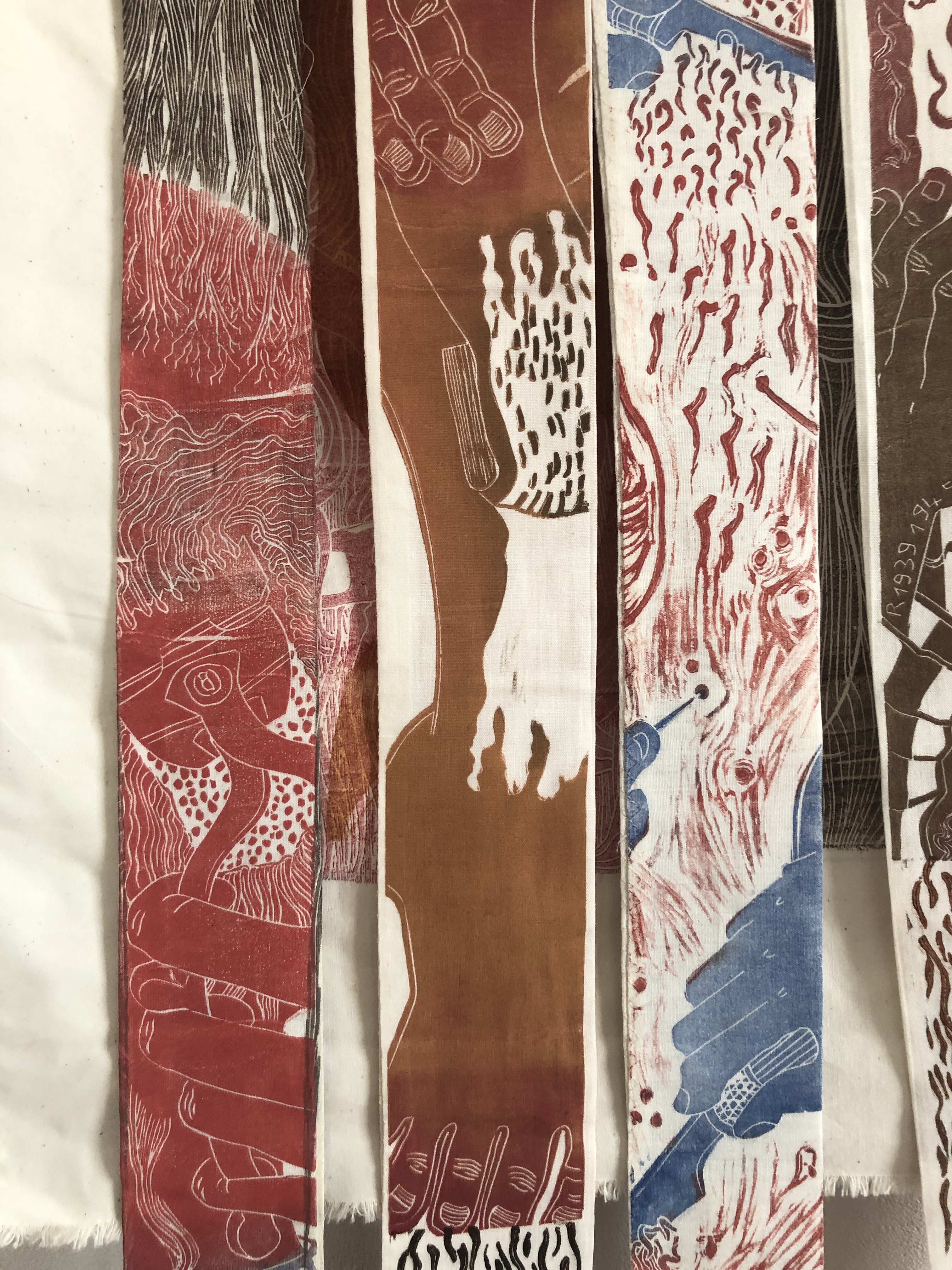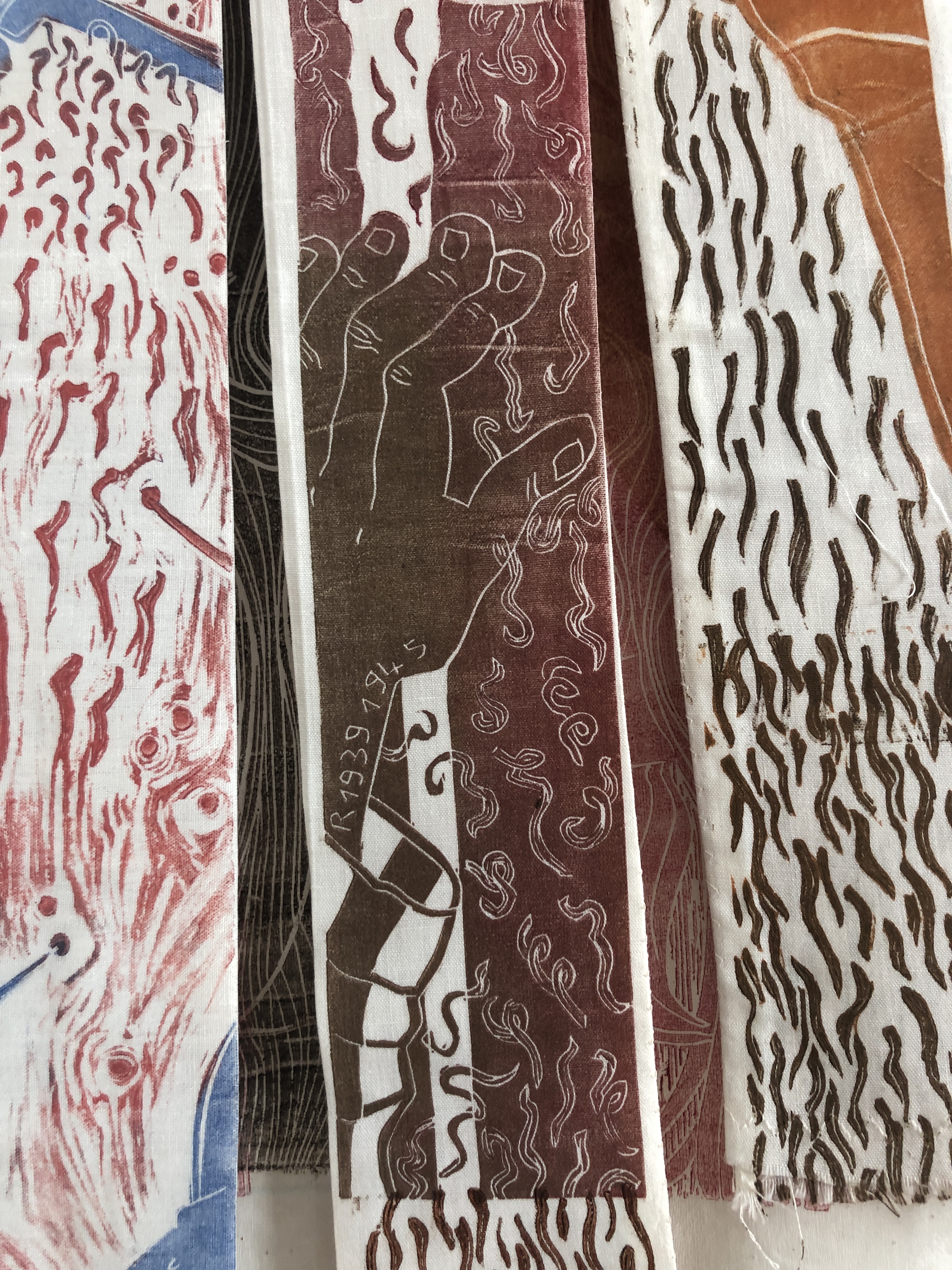 Au bout du rouleau évoque l’épuisement. Cette fatigue que l’on éprouve parfois en tant que femme, mère, artiste, être humain … face aux normes, aux injonctions, à la prédation, à l’intolérance, … C’est aussi un clin d’œil sur l’outil et ses usages : écrasement, relais, embellissement (coiffure, gazon), cuisine, protection (Talmud, des papyrus), performance (surf), pilotage (manche avion), céramique et gravure, …