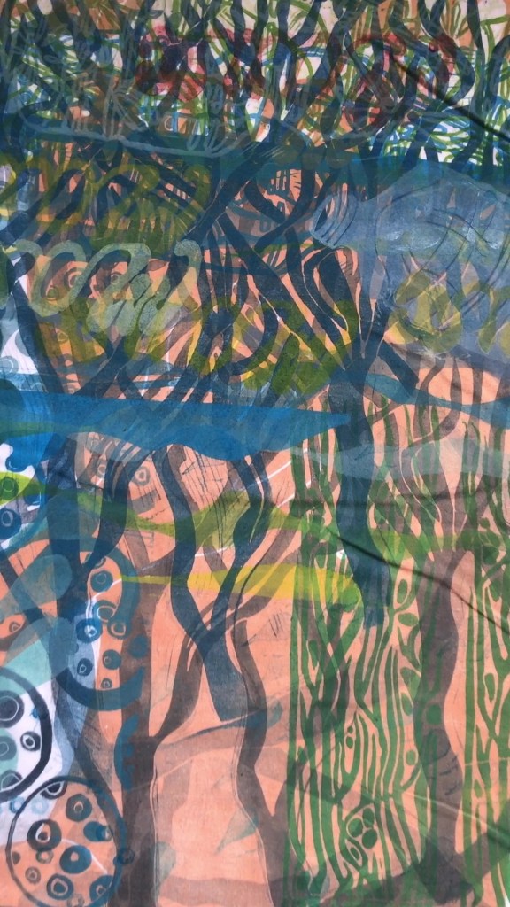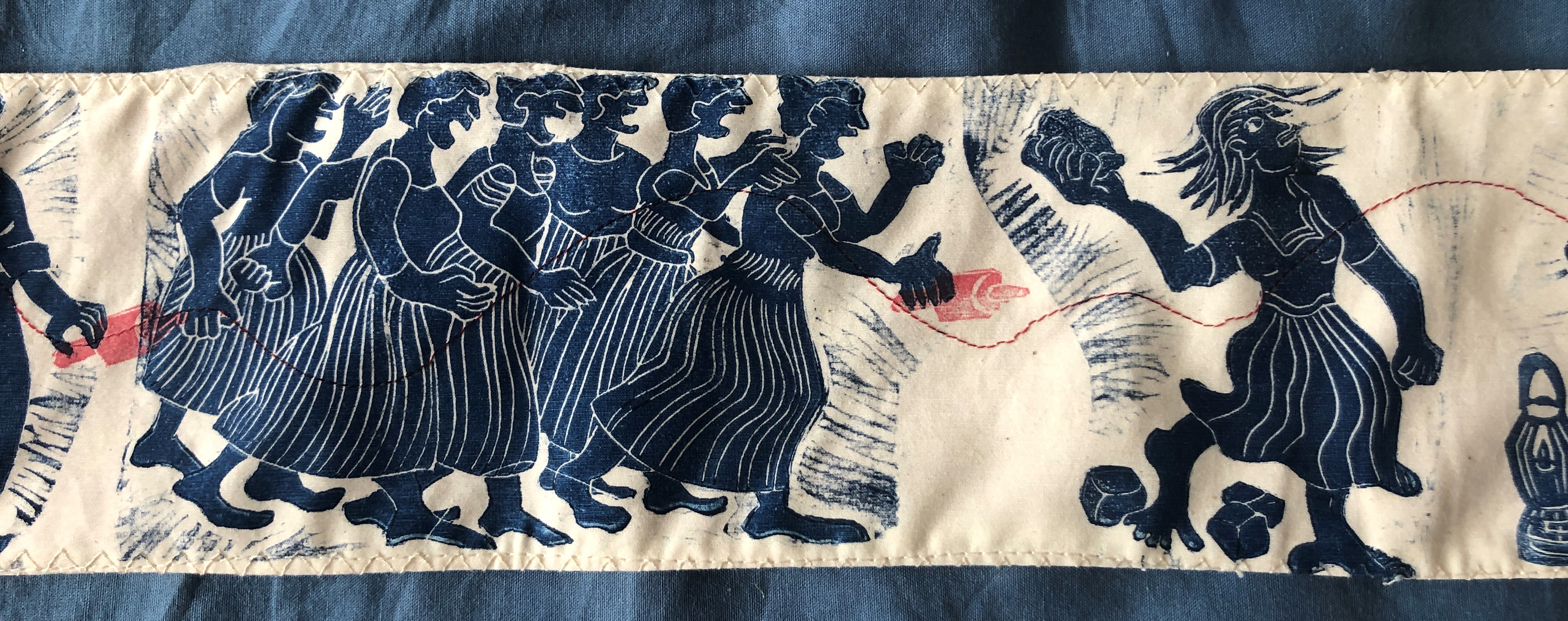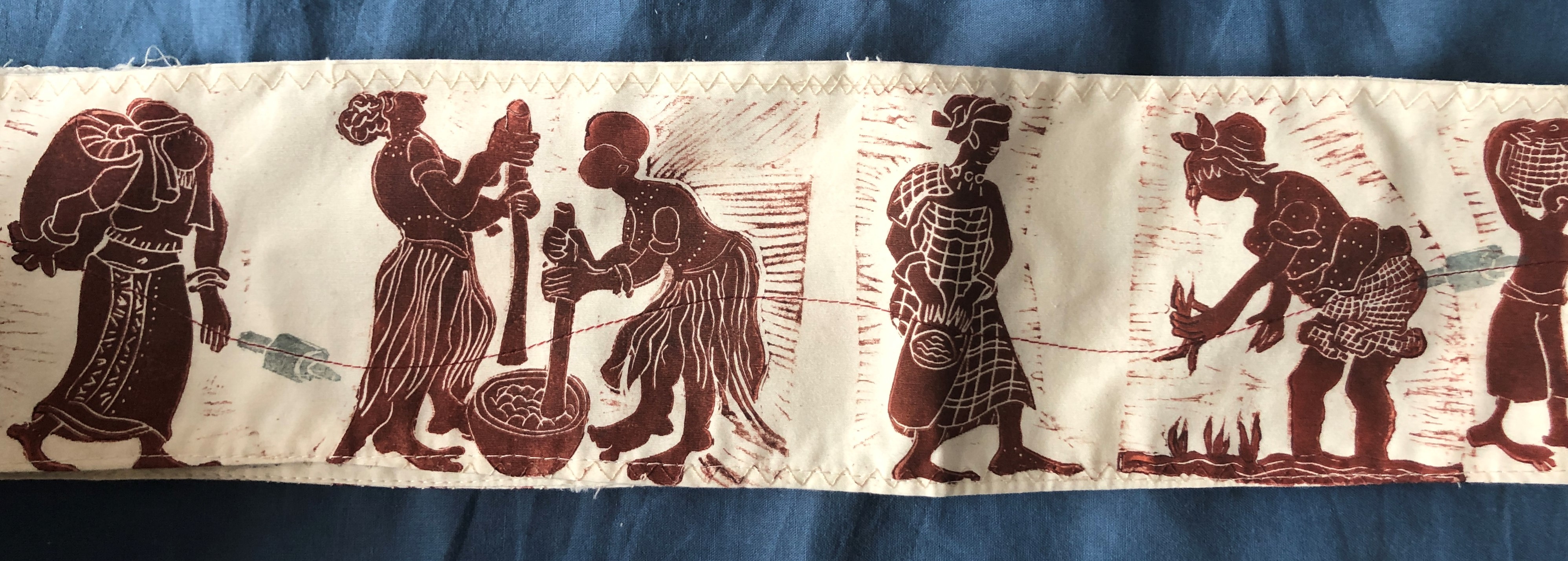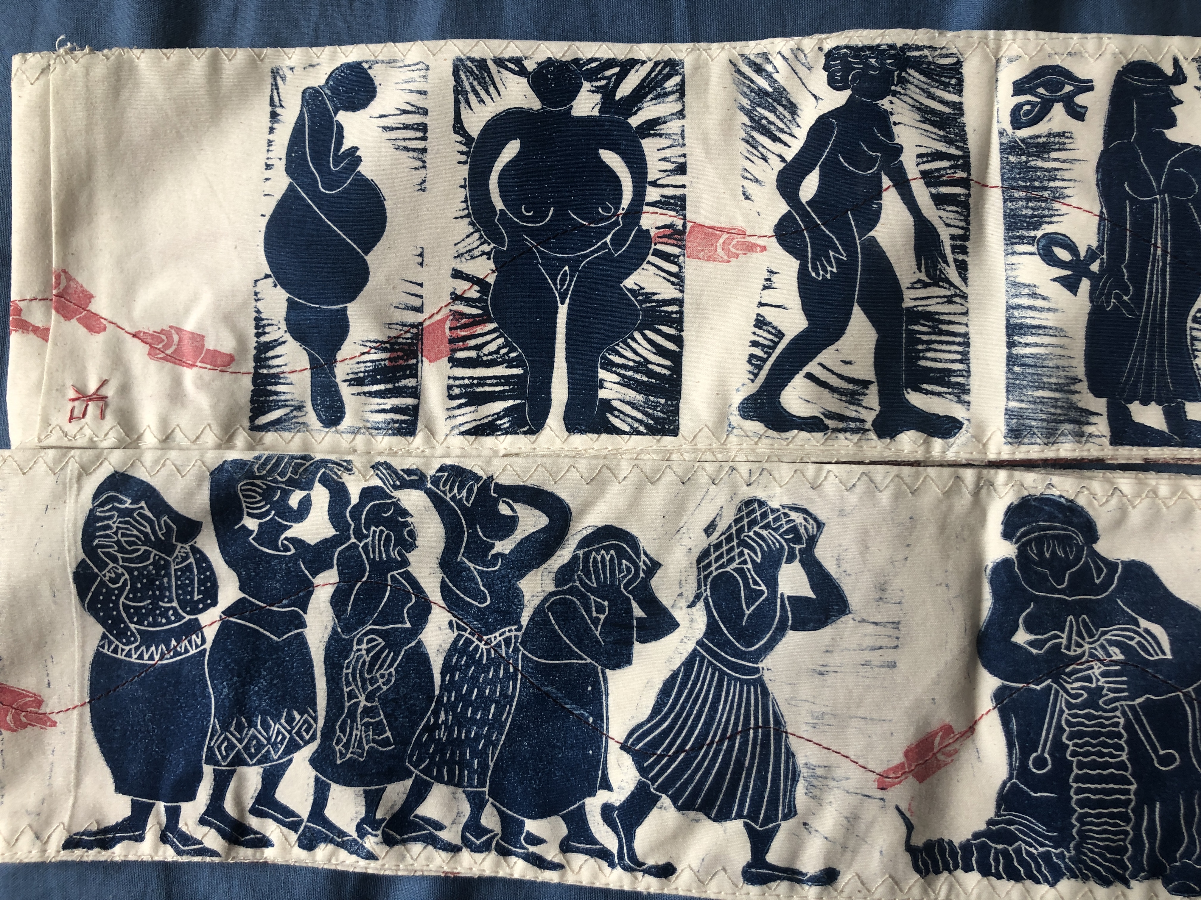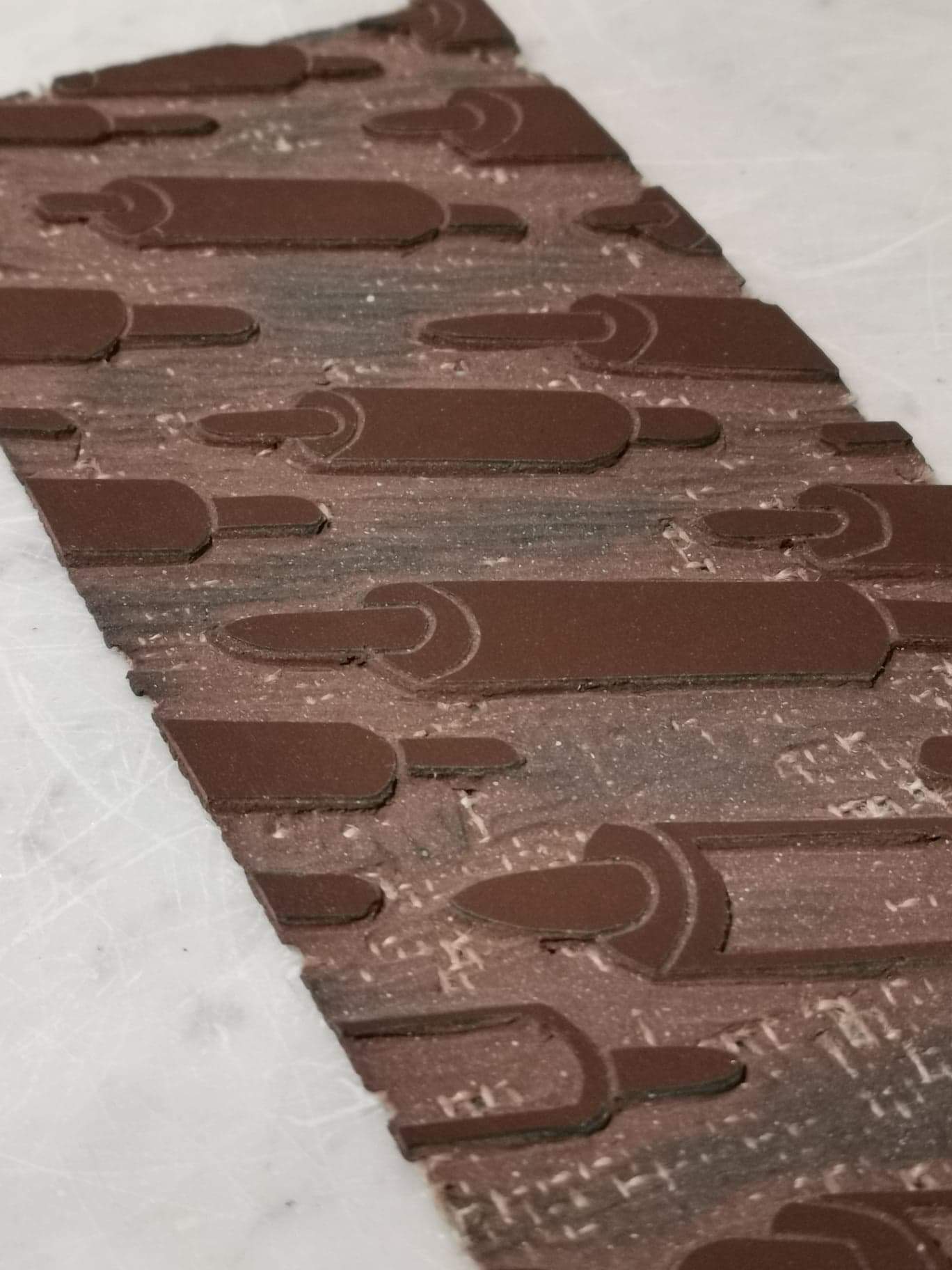 Au bout du rouleau évoque l’épuisement. Cette fatigue que l’on éprouve parfois en tant que femme, mère, artiste, être humain … face aux normes, aux injonctions, à la prédation, à l’intolérance, … C’est aussi un clin d’œil sur l’outil et ses usages : écrasement, relais, embellissement (coiffure, gazon), cuisine, protection (Talmud, des papyrus), performance (surf), pilotage (manche avion), céramique et gravure, …