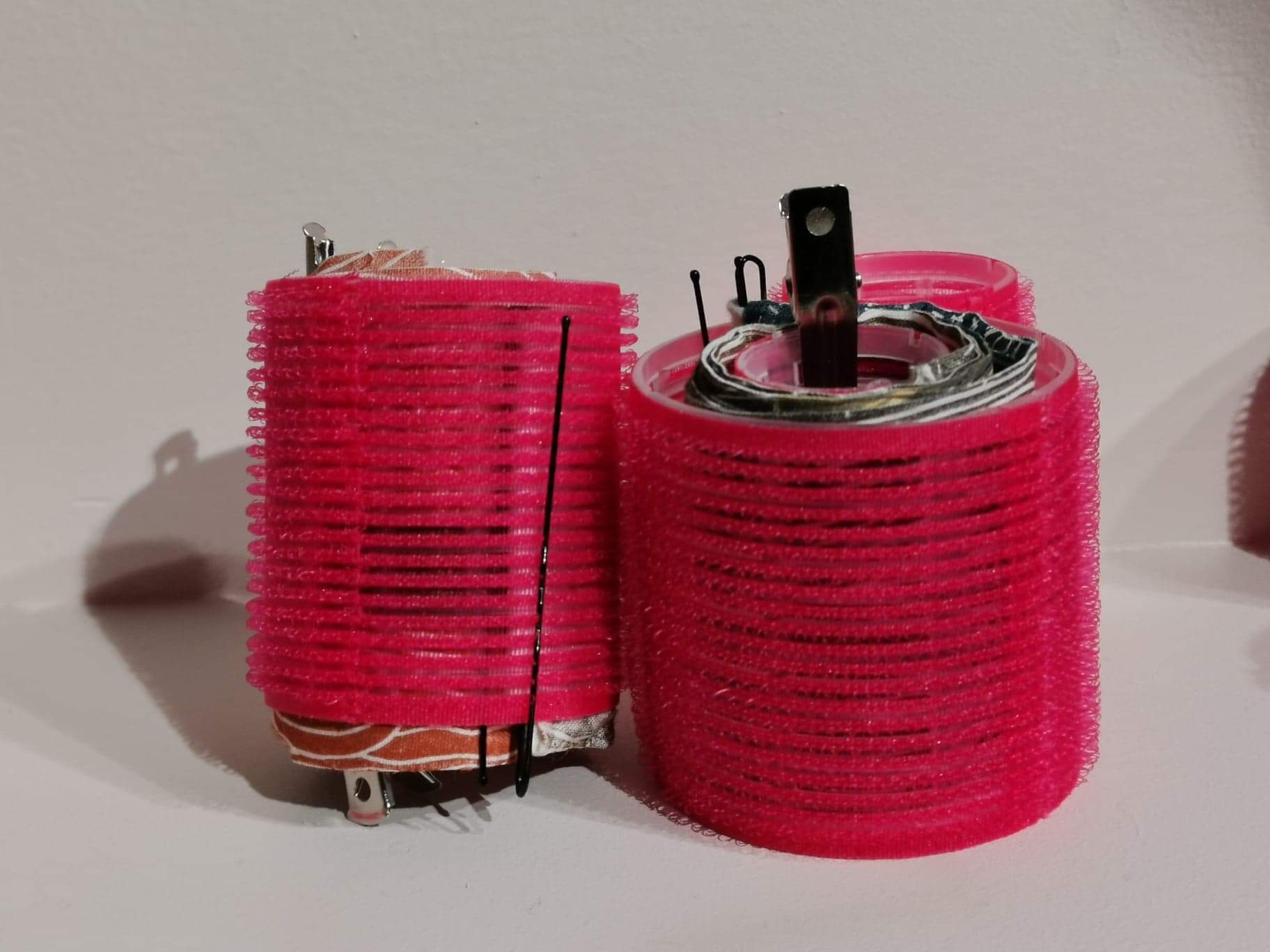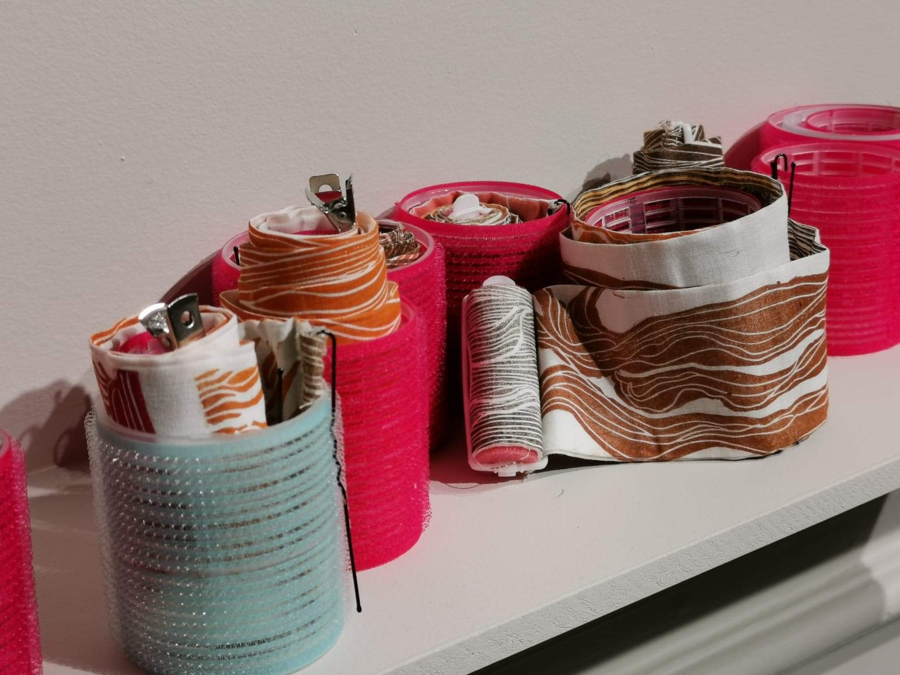 L’installation évoque ces situations en jouant de l’enroulement des bandes de tissu sur des rouleaux à friser.