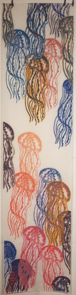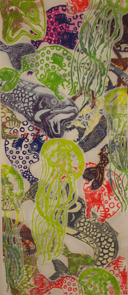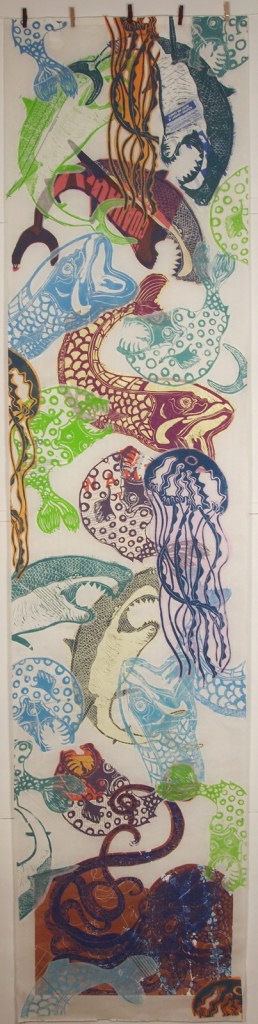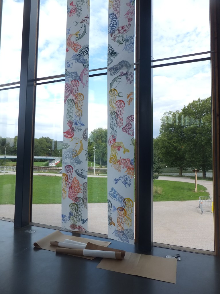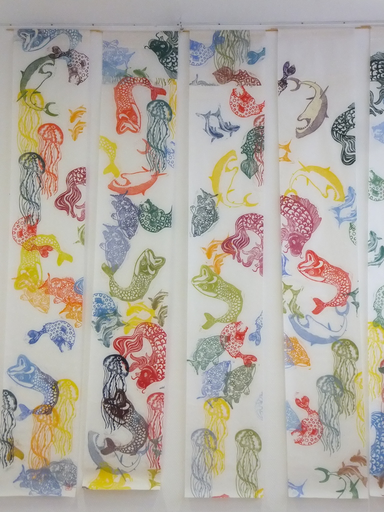 De longs kakémonos en papier Wenzhou (Chine), supports d’impressions lino et de collages, de motifs répétés superposés, pour recréer cette sensation de multitude chatoyante.