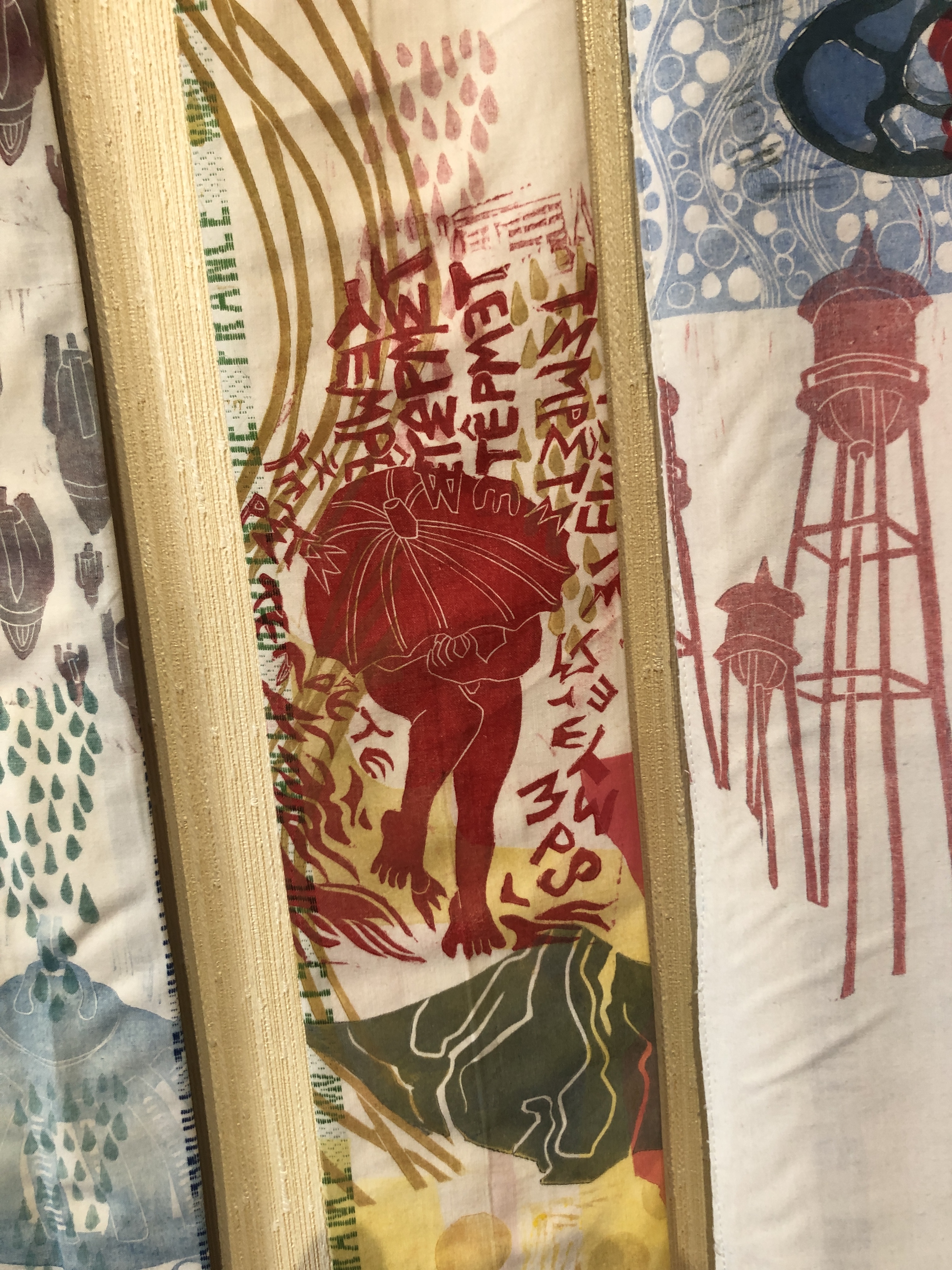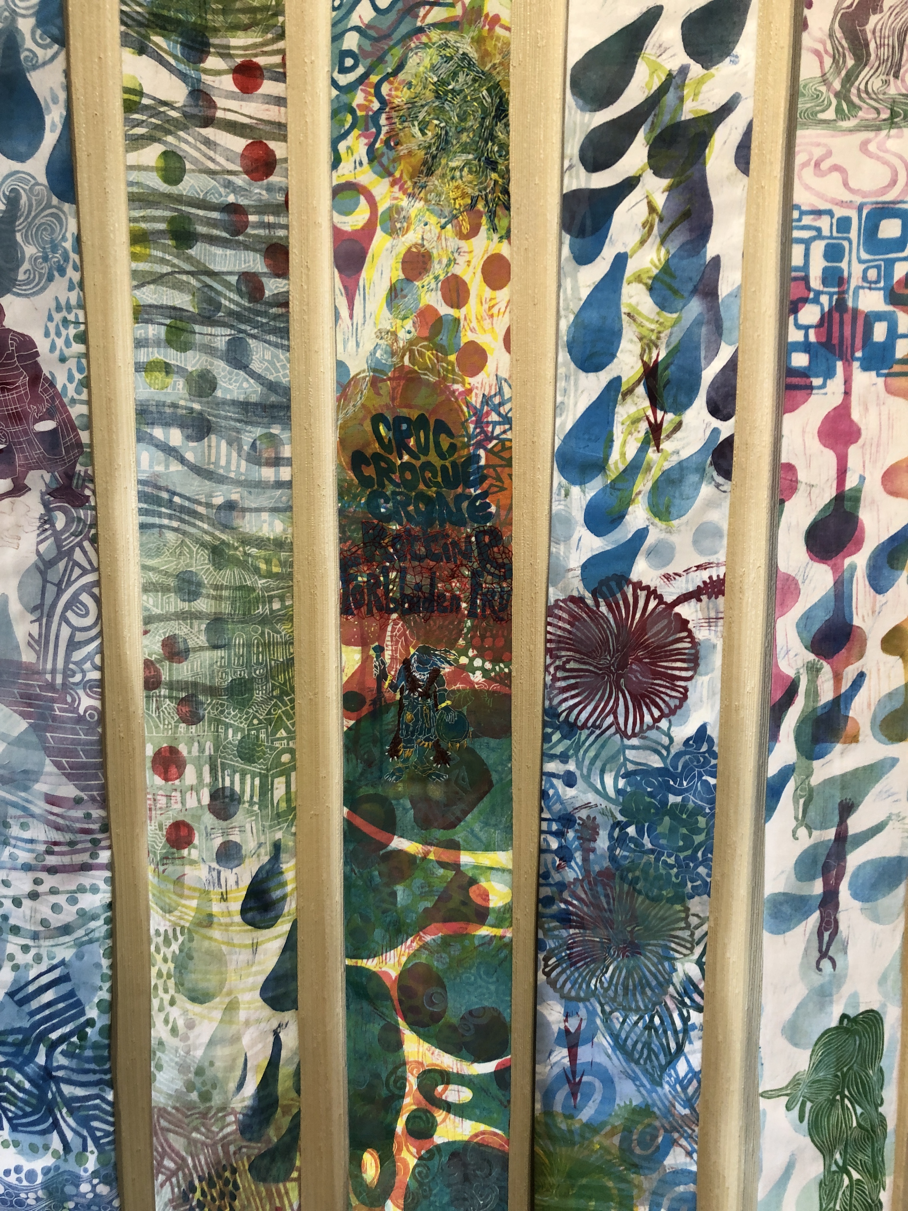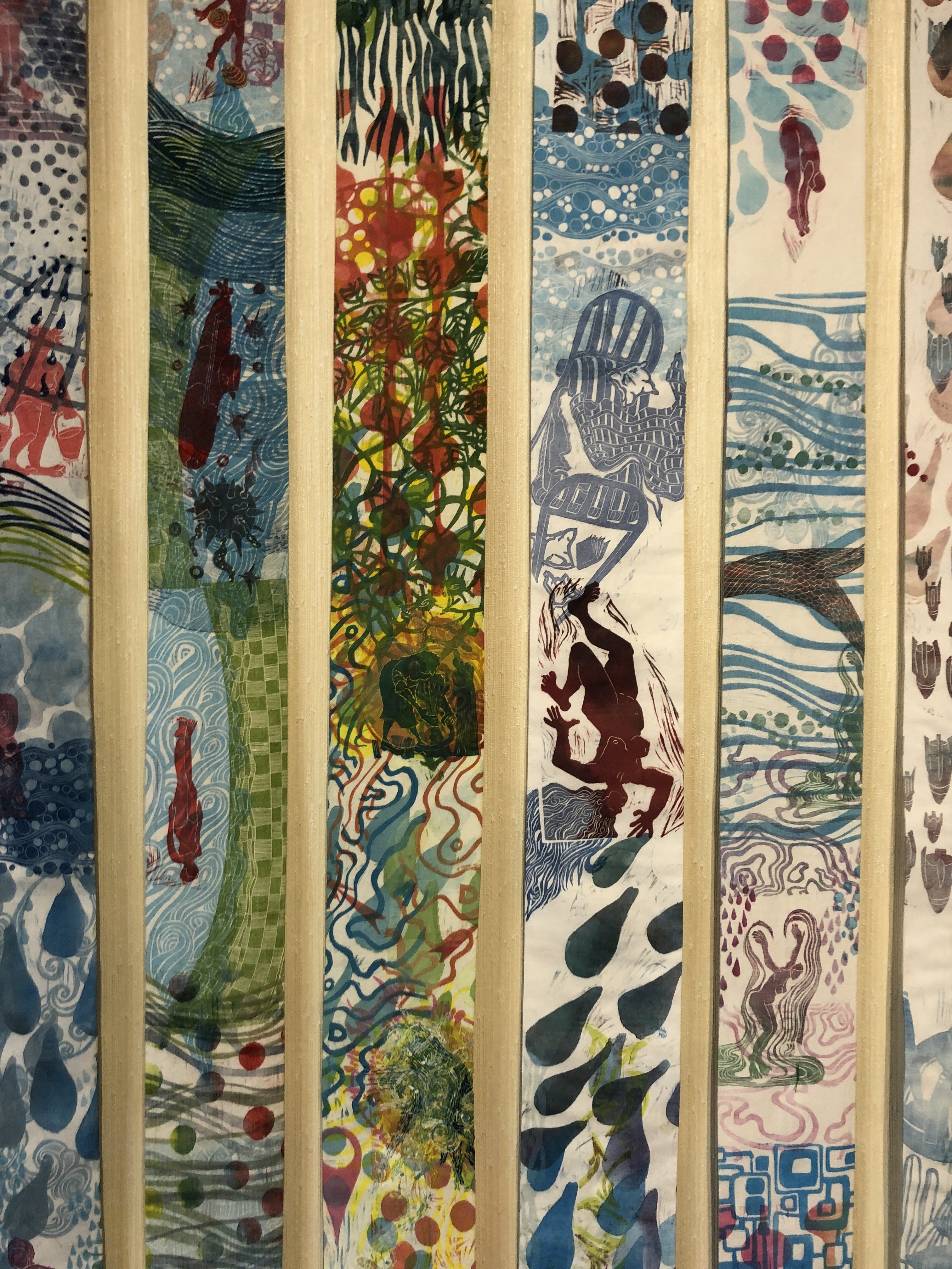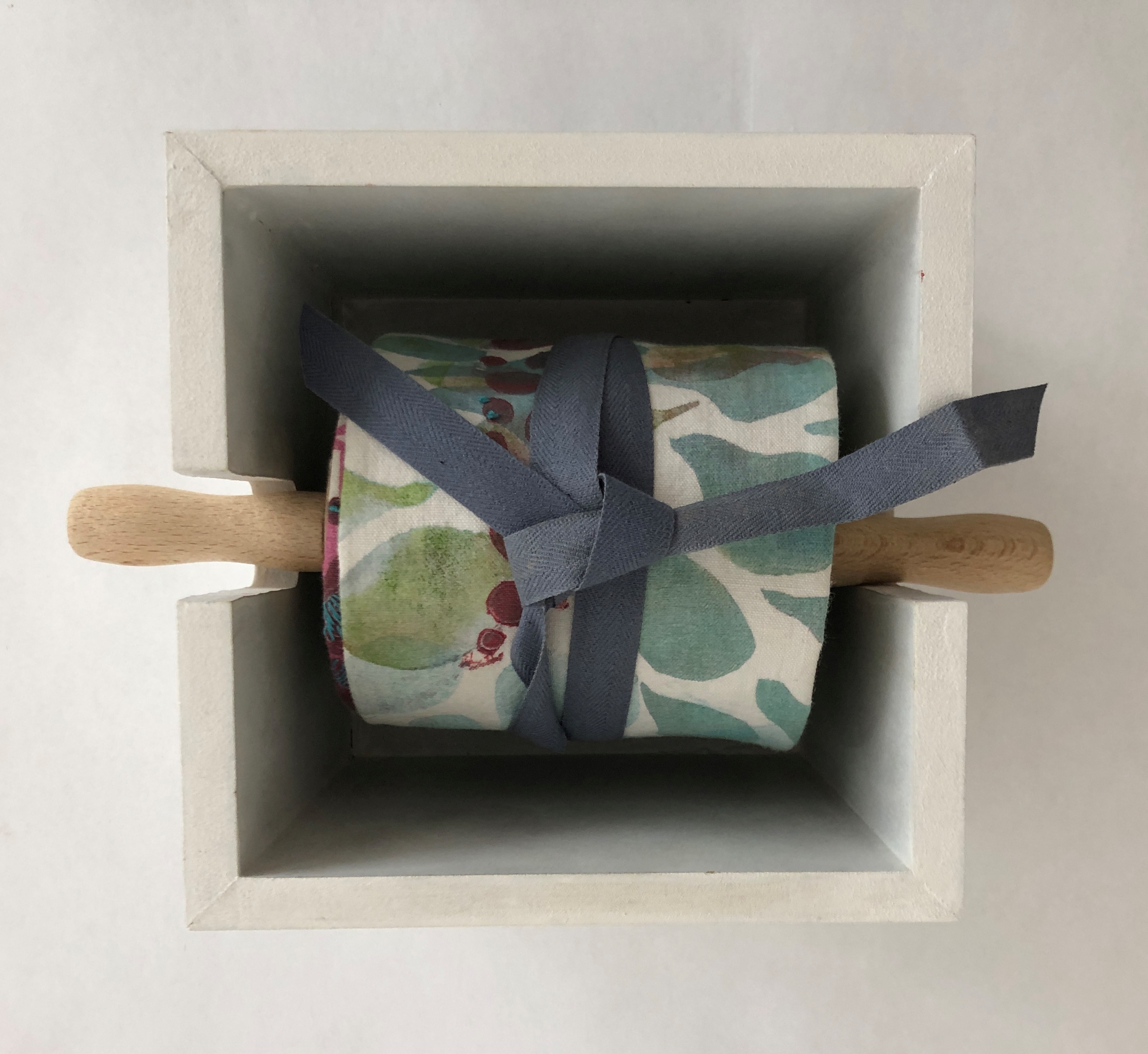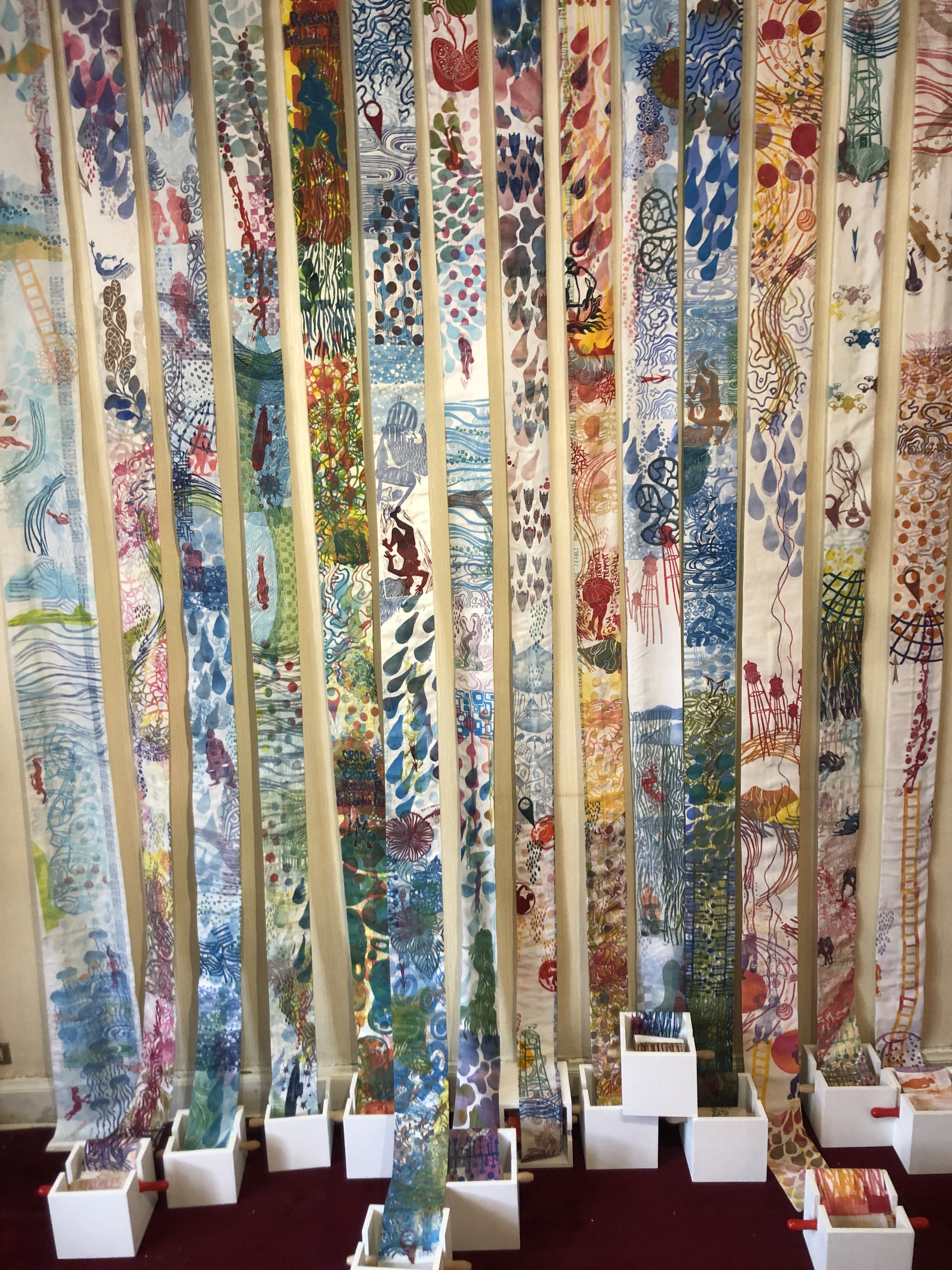13 kakemonos, largeur moyenne 11 cm, longueurs entre 250 et 300 cm. multi impressions de matrices linogravées sur draps hospitaliers ou anciens, encres gravure, quelques rehauts avec fils couleur, boites cubiques laquées blanc de 16 x 16x 16 cm, rouleaux à pâtisserie en bois (modèle enfant)