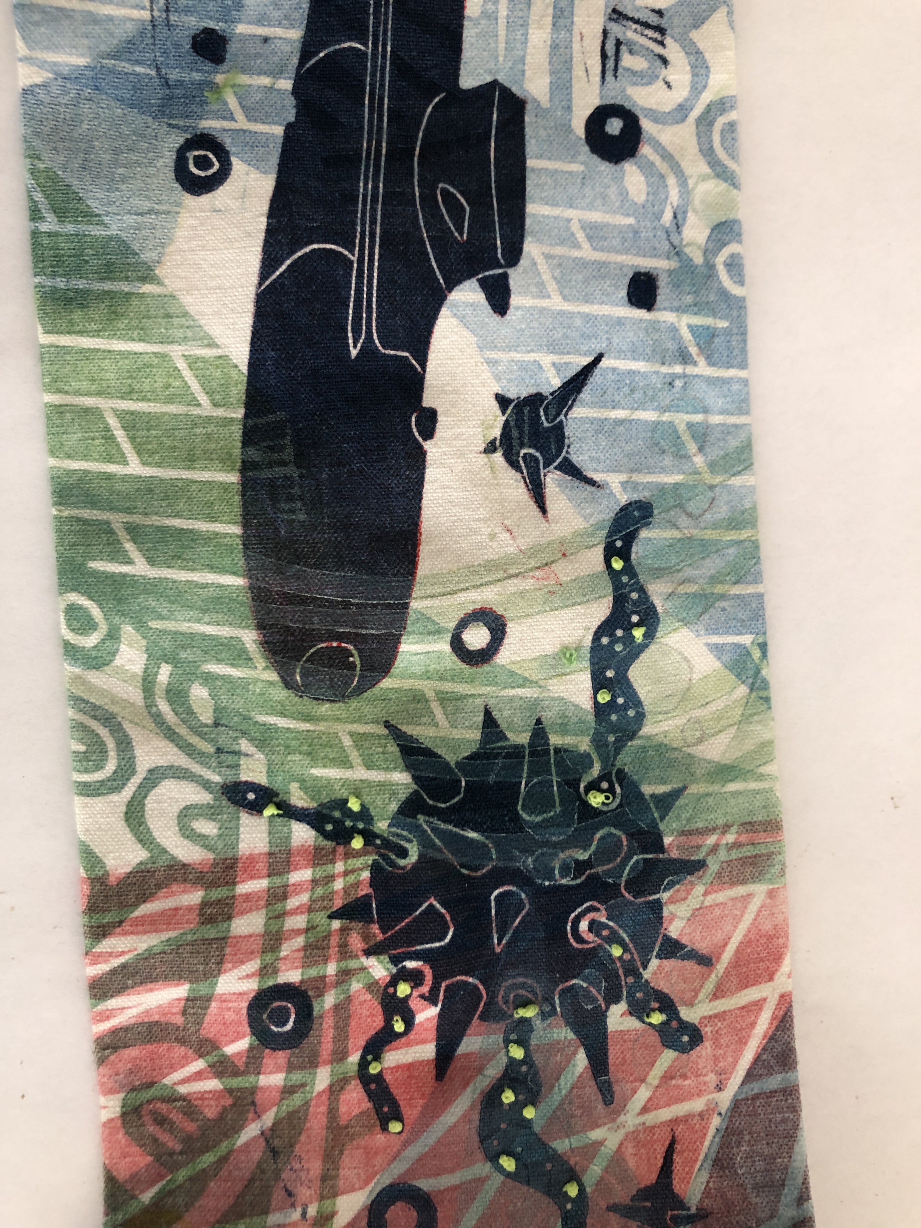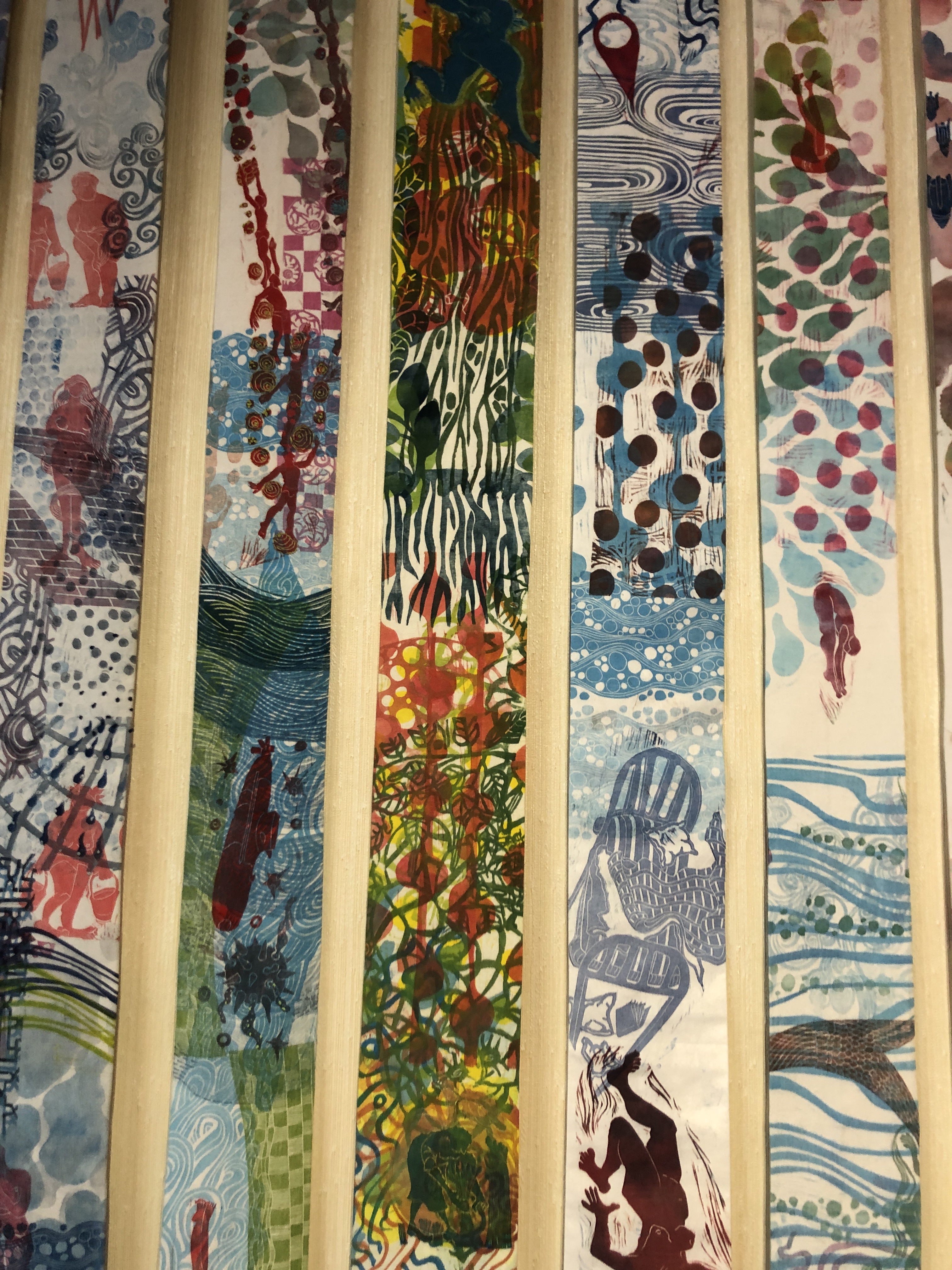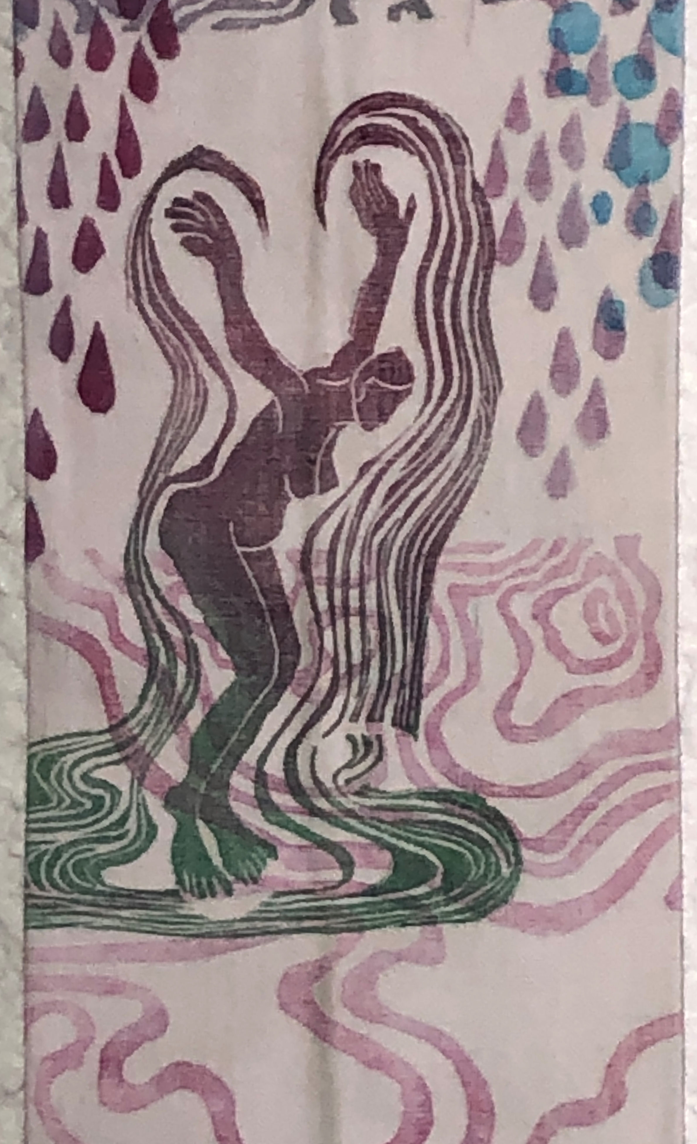 ou les tempêtes qui traversent nos vies. En saisir des bribes, peines et joies. Transposer ces émotions, en couleurs, motifs, mots mêlés, superposés jusqu’à l’illisible, pour en exprimer l’intensité. Les partager comme on déroule de courtes histoires sous forme de longs, étroits rotulus . Chacun ensuite y projette ses propres émotions.