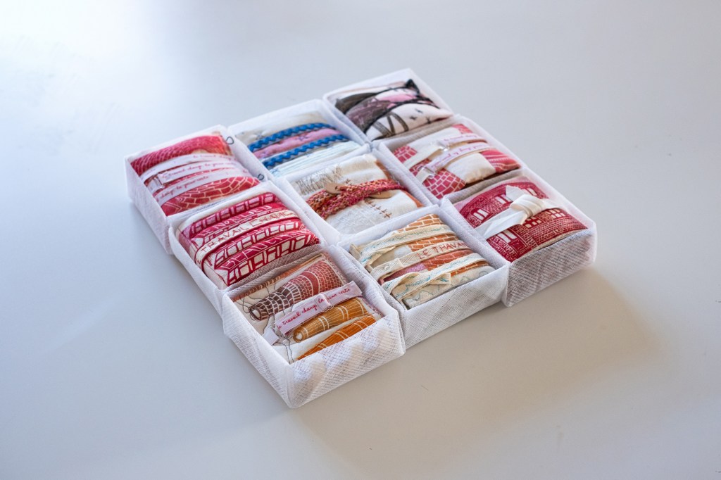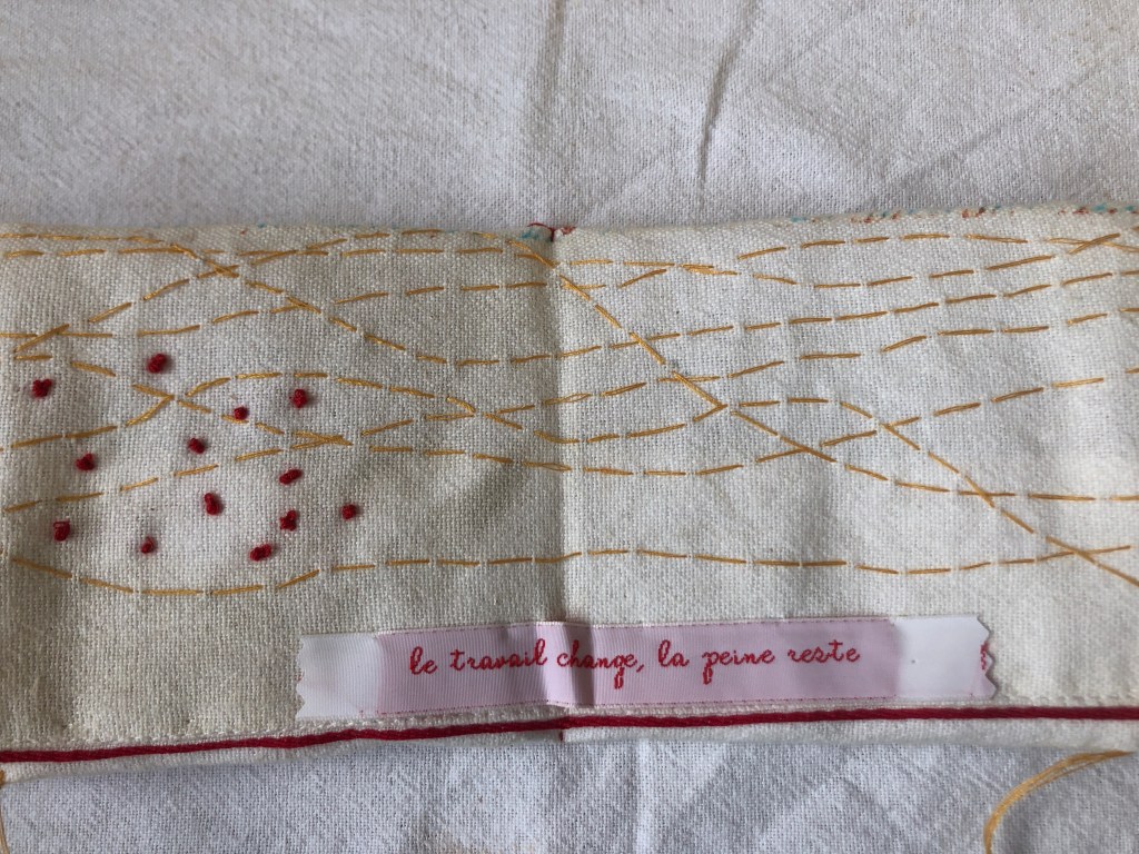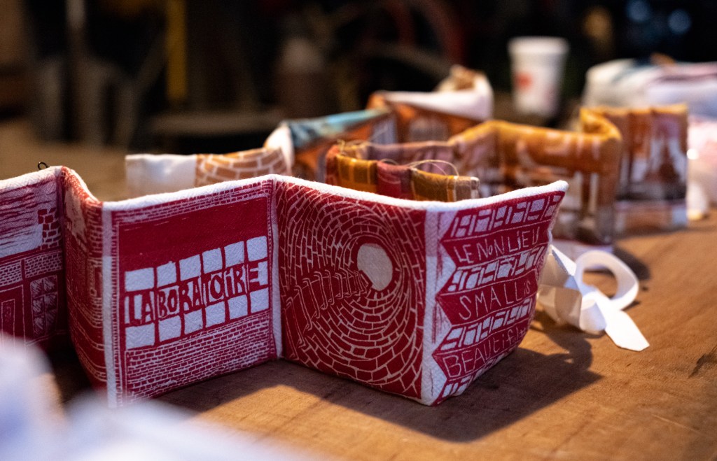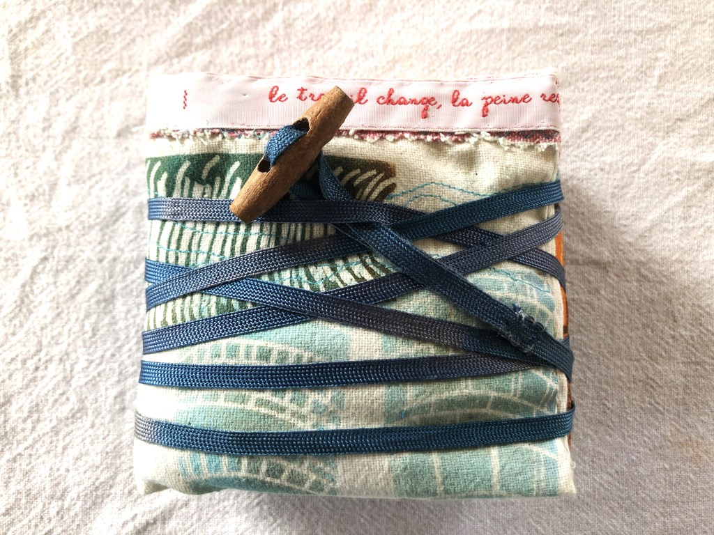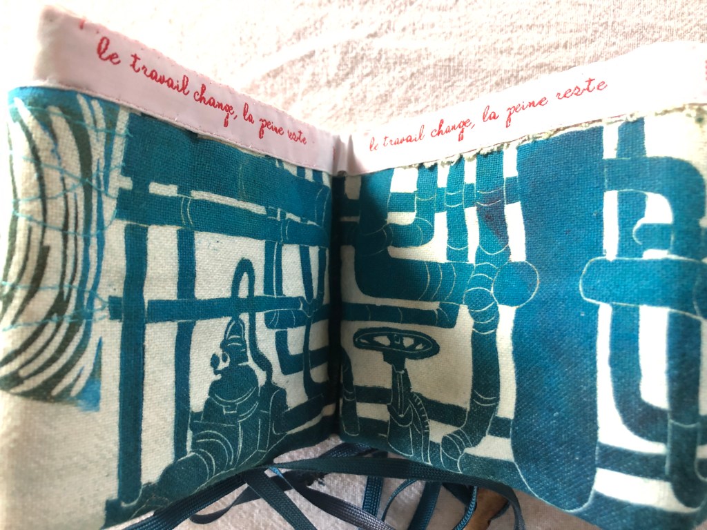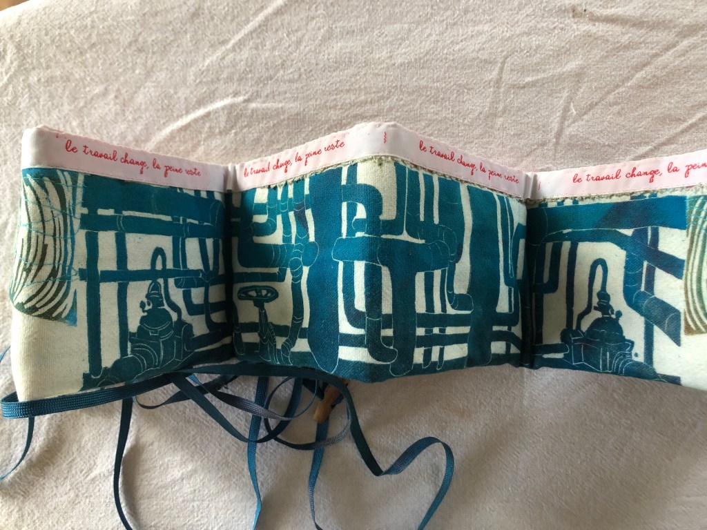 17 leporellos textile, impressions lino inspirées ou non de façades d’usines remarquables, recto verso, sur de vieux torchons coton, dotés de 2 bandes rouges, molleton et broderies couture libre, fermetures variables, présentation dans une première enveloppe en tarlatane, 10x10x10 cm, 6 plis