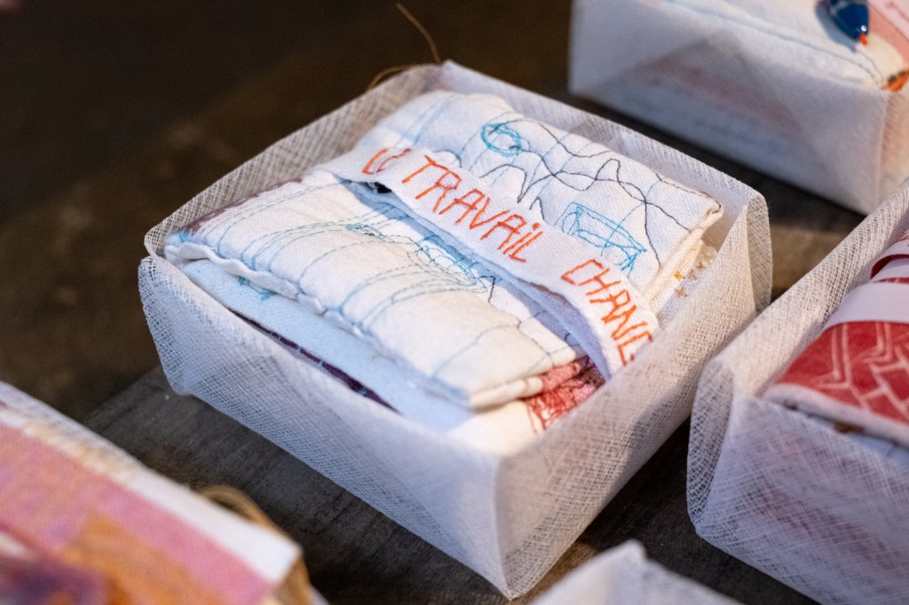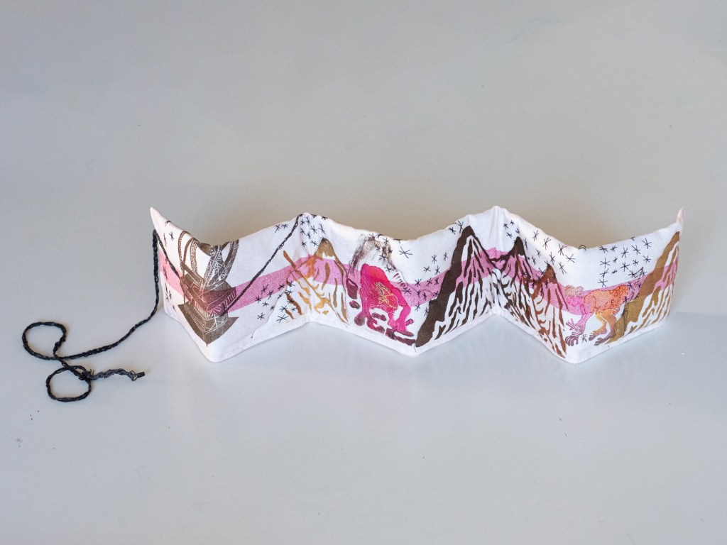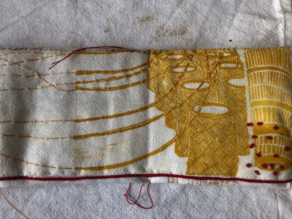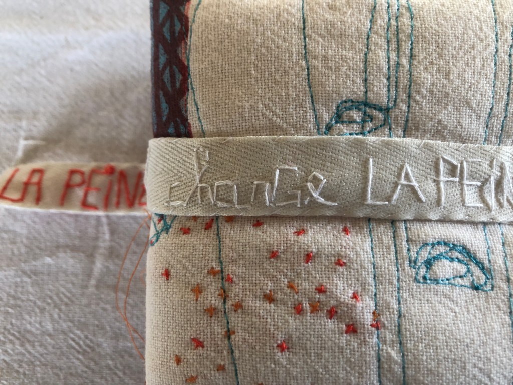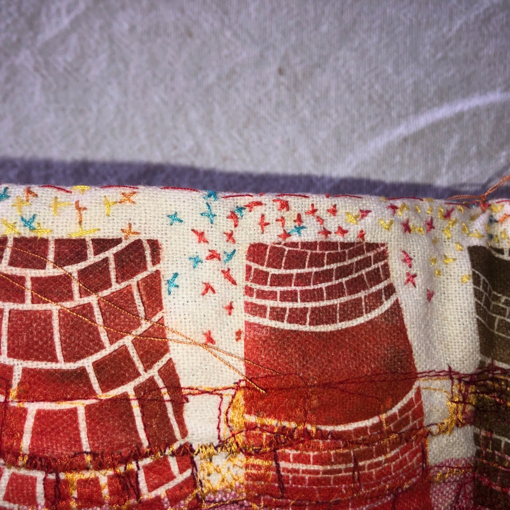 17 leporellos textile, impressions lino inspirées ou non de façades d’usines remarquables, recto verso, sur de vieux torchons coton, dotés de 2 bandes rouges, molleton et broderies couture libre, fermetures variables, présentation dans une première enveloppe en tarlatane, 10x10x10 cm, 6 plis