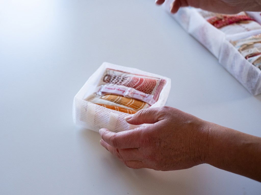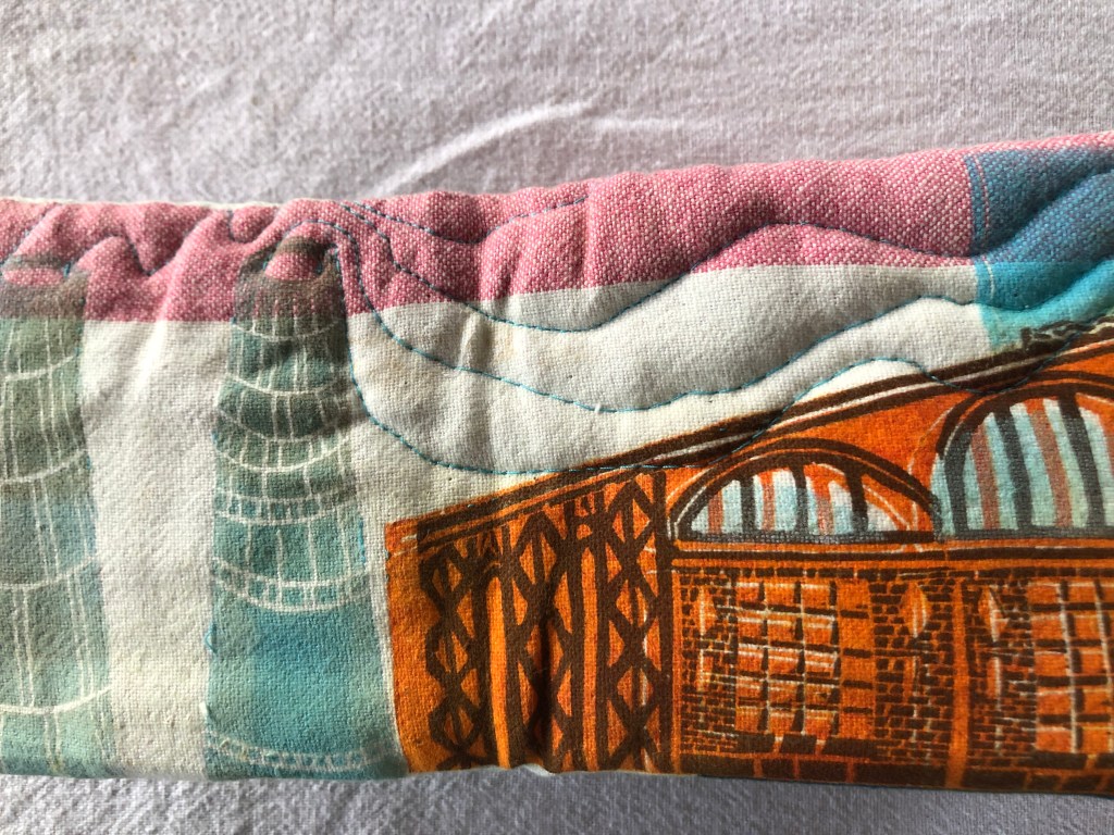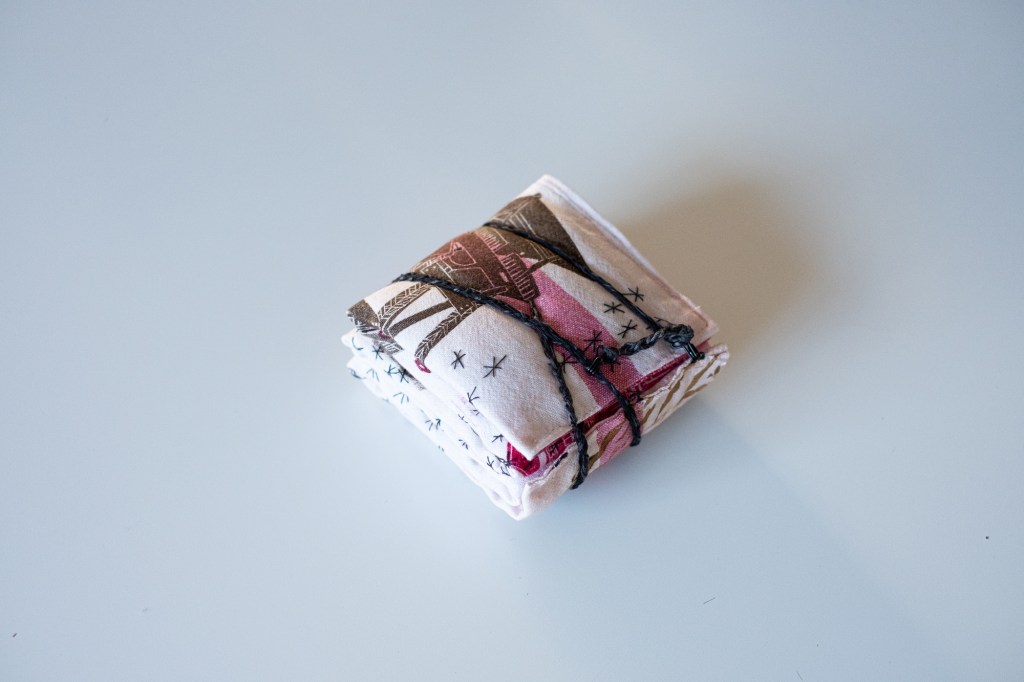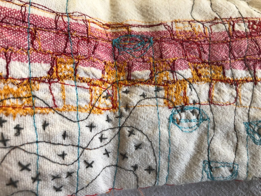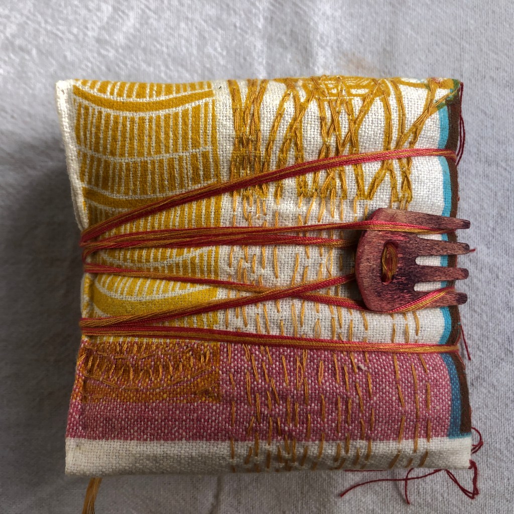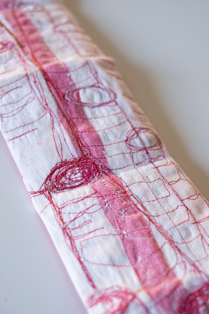 17 leporellos textile, impressions lino inspirées ou non de façades d’usines remarquables, recto verso, sur de vieux torchons coton, dotés de 2 bandes rouges, molleton et broderies couture libre, fermetures variables, présentation dans une première enveloppe en tarlatane, 10x10x10 cm, 6 plis