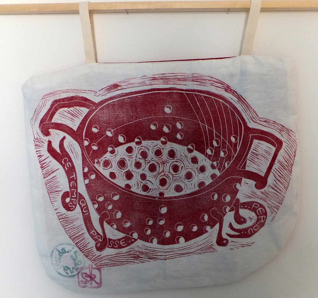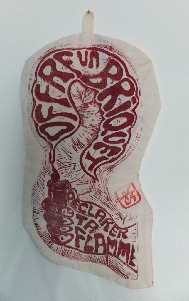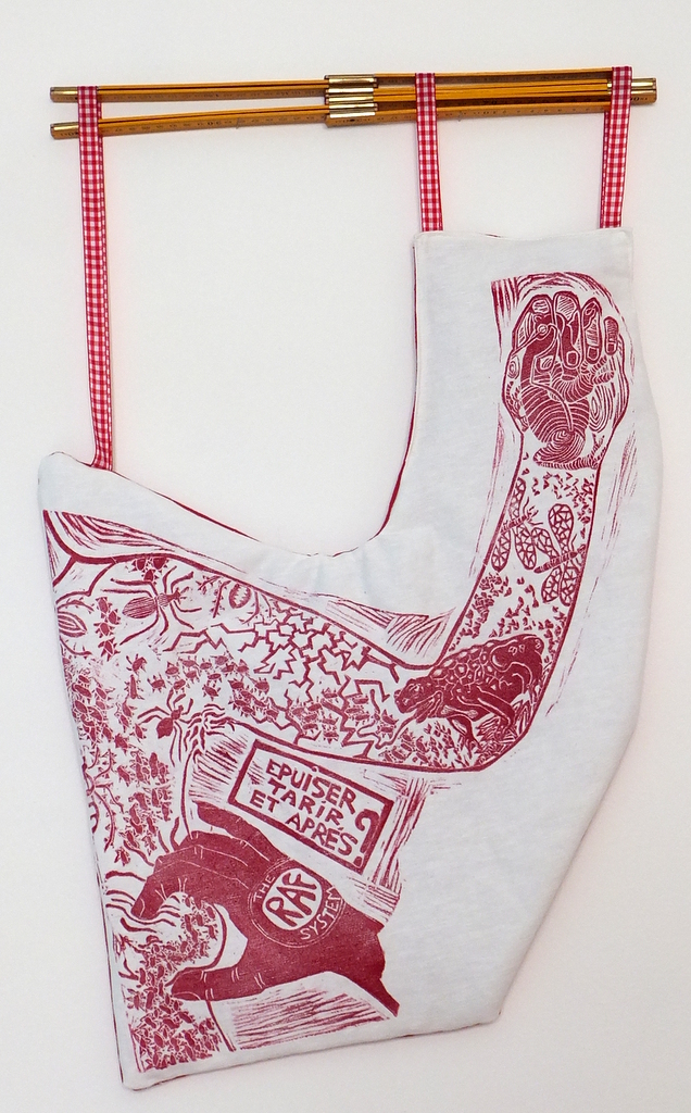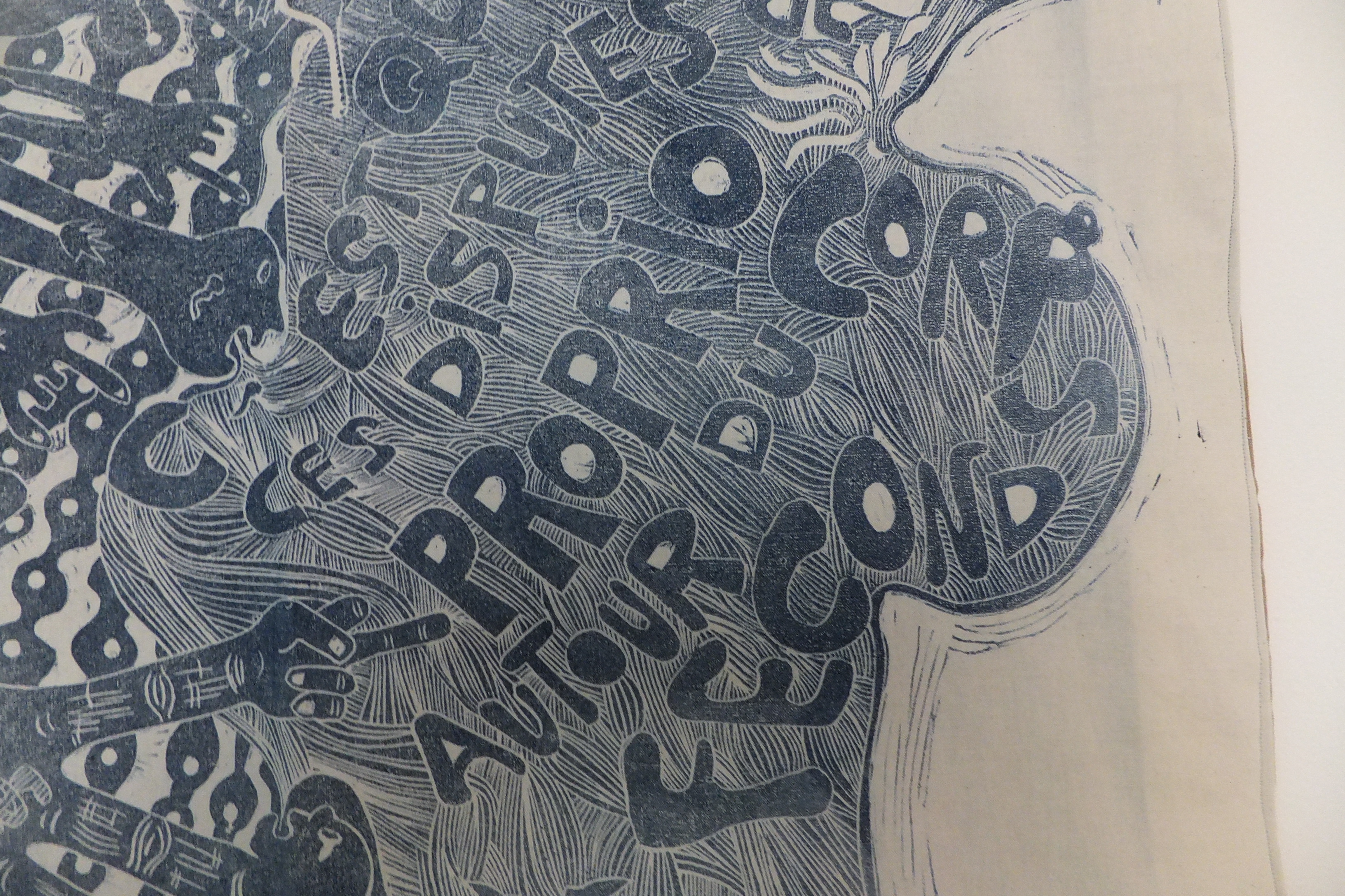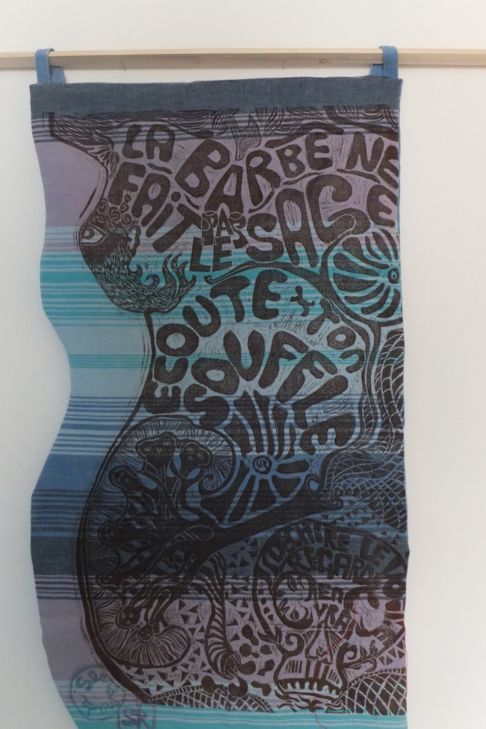 Je fabrique par linogravure, des estampes textiles, contournant la fragilité du papier, dans le but qu’elles circulent, soient mises en poche, transportées et accrochées dans les espaces de vie, privé et professionnel.