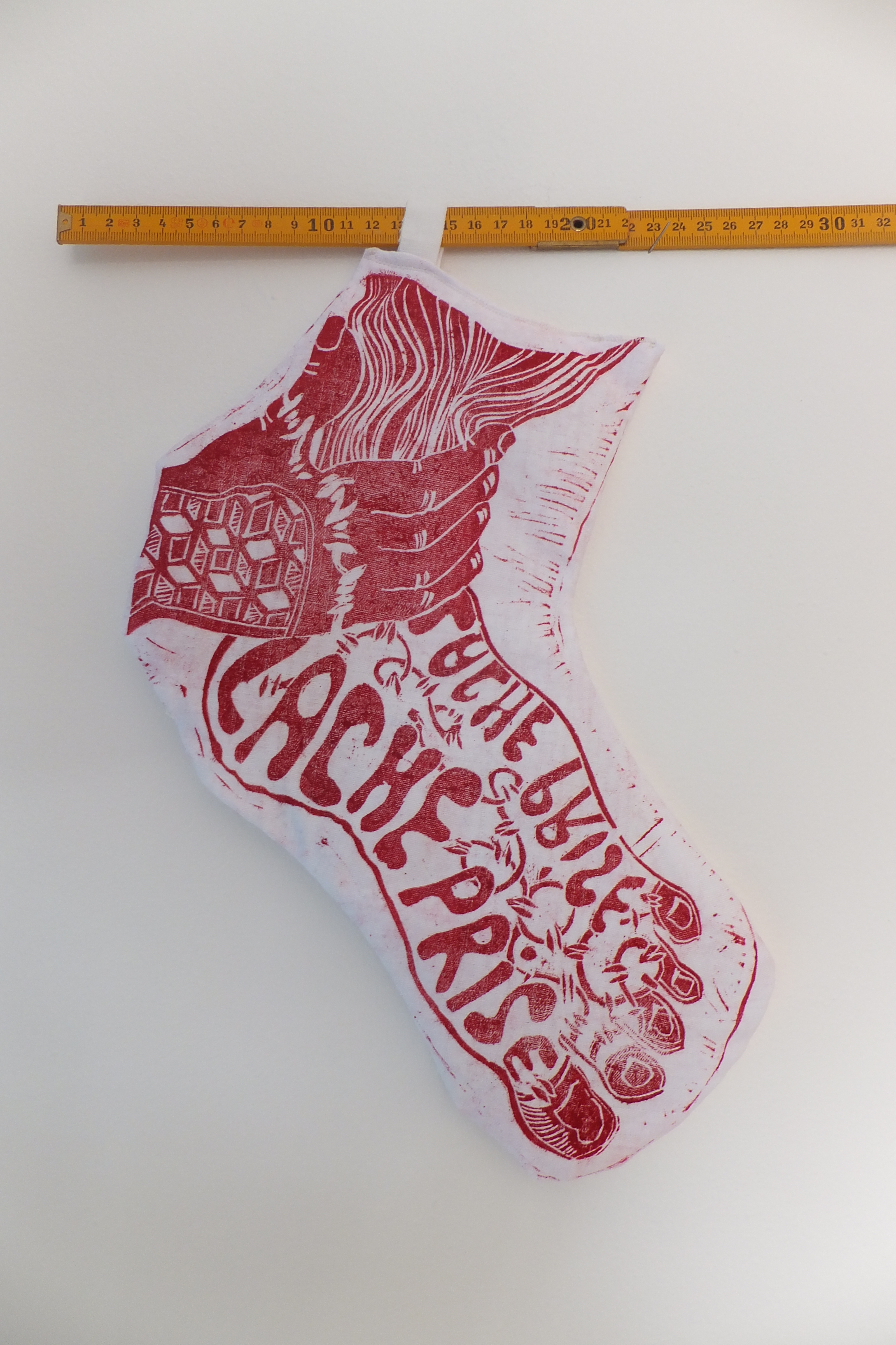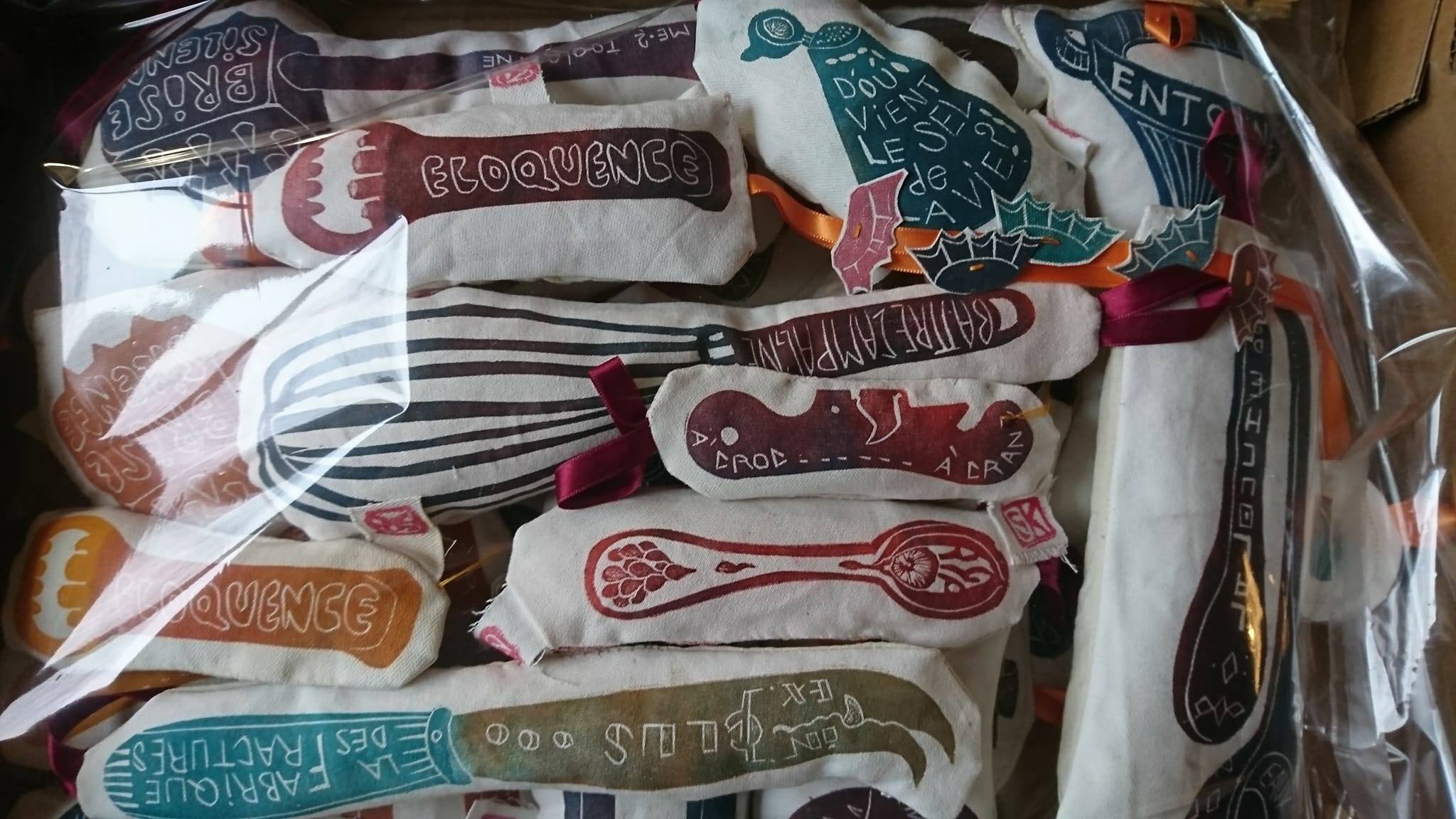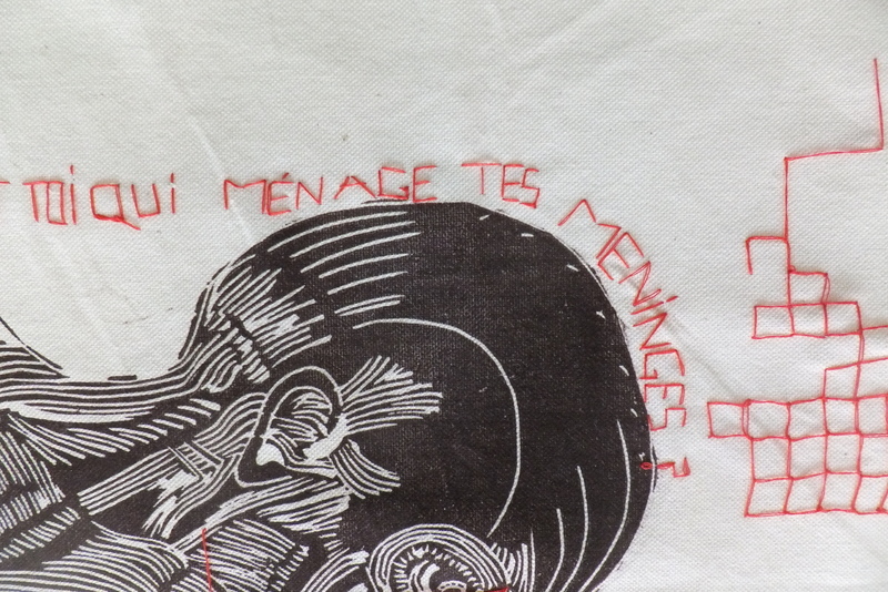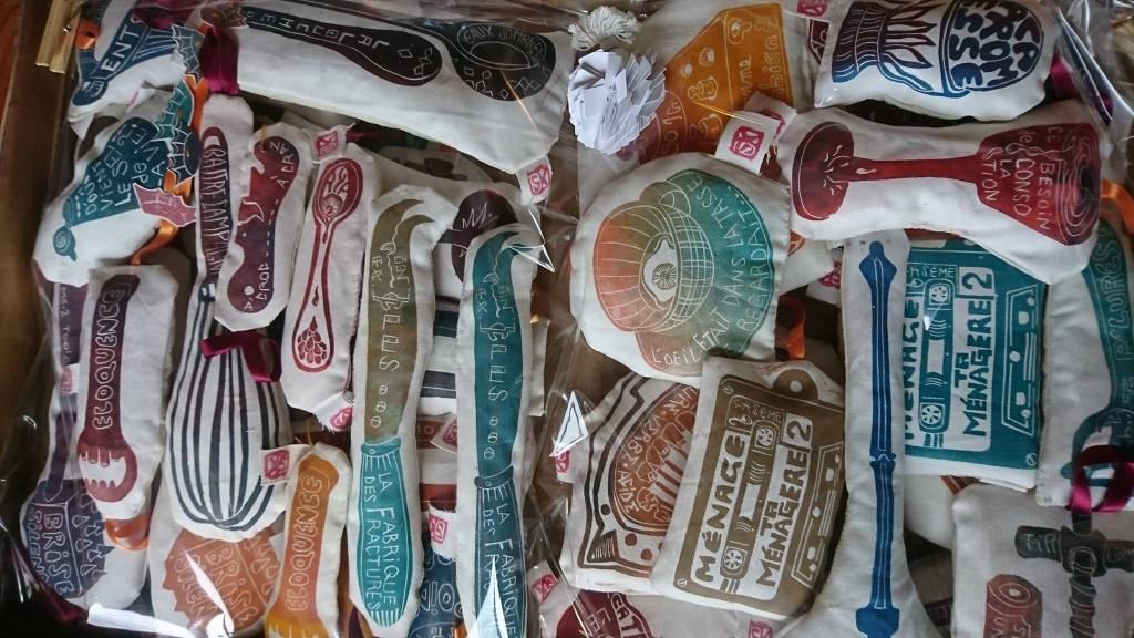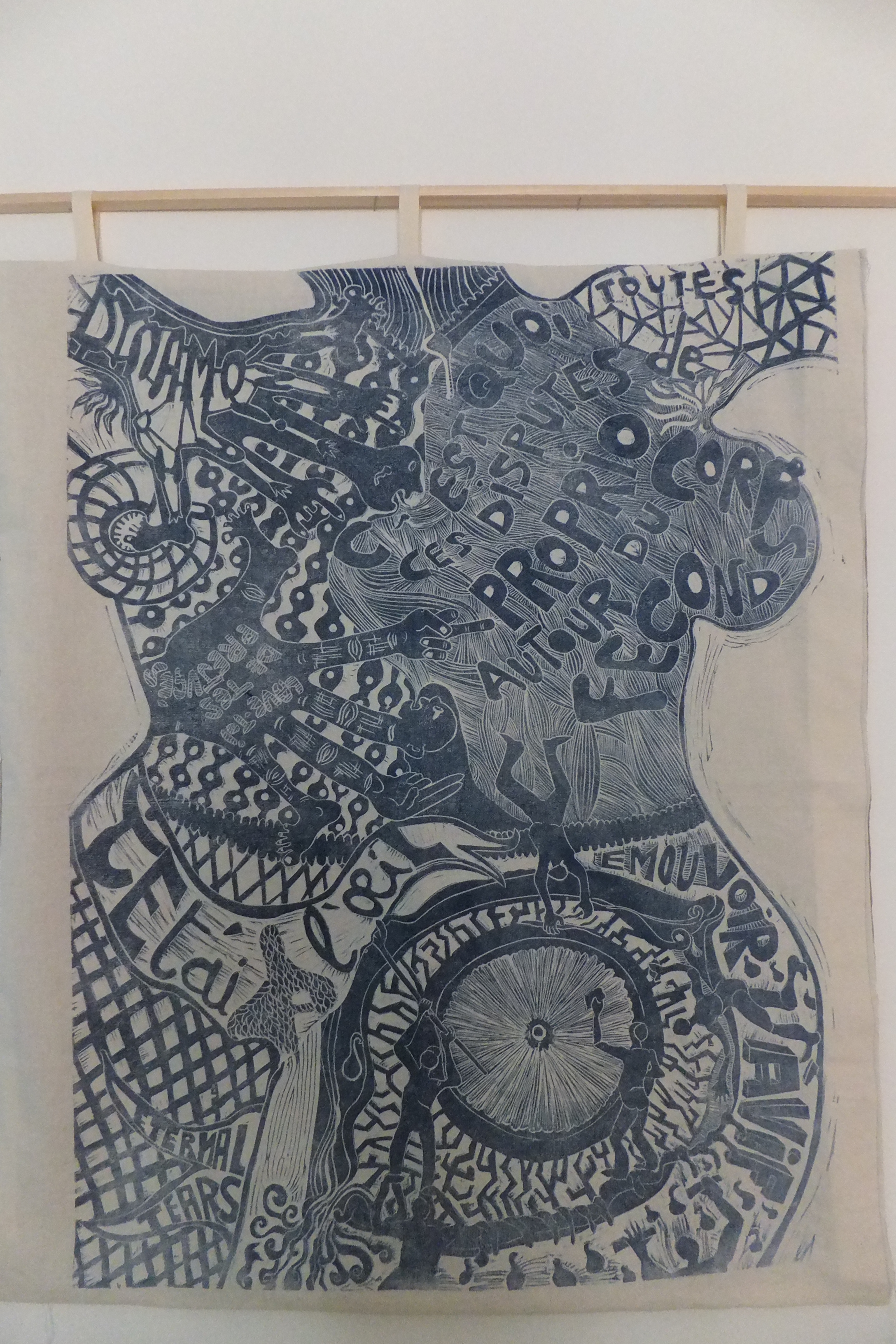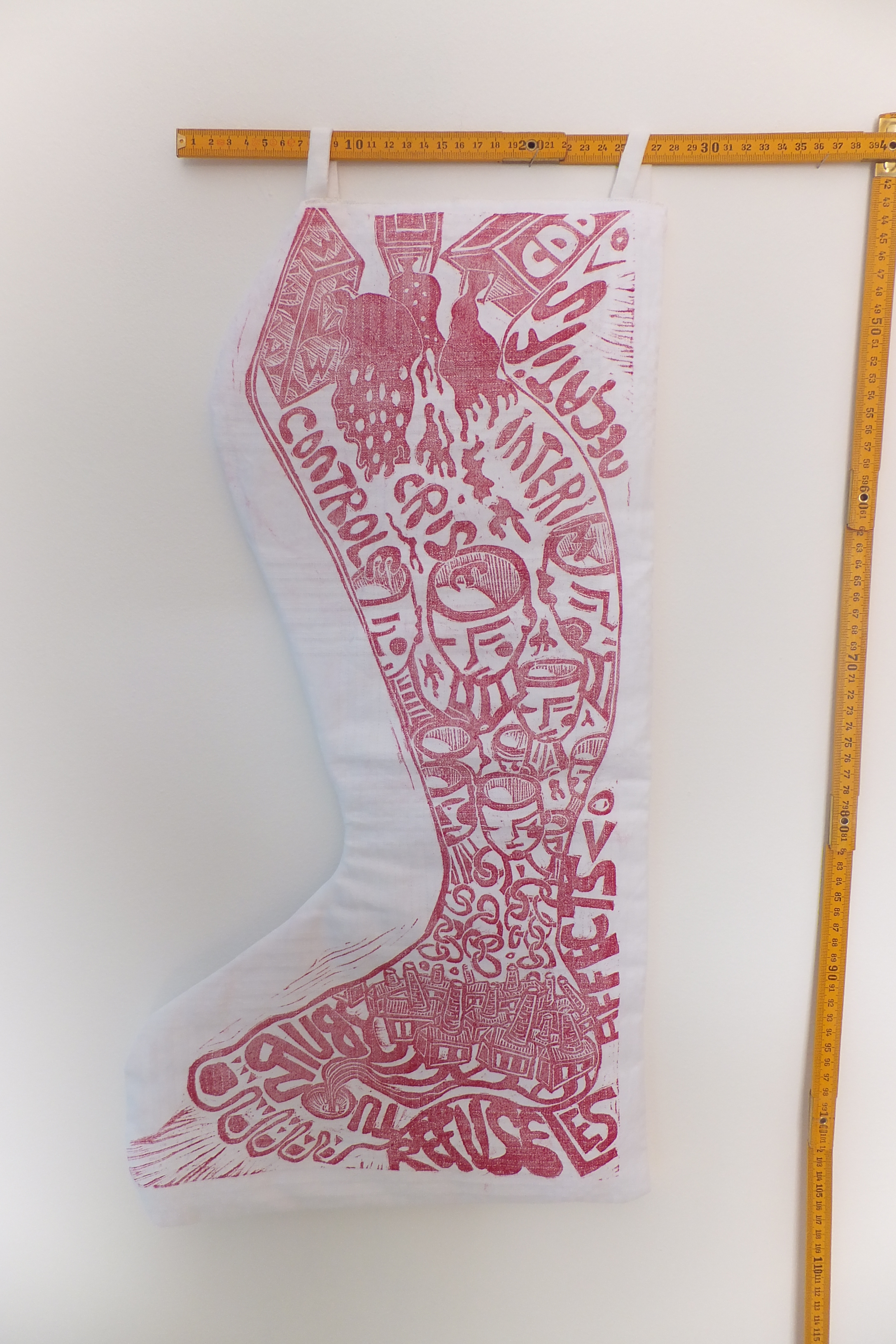 Je fabrique par linogravure, des estampes textiles, contournant la fragilité du papier, dans le but qu’elles circulent, soient mises en poche, transportées et accrochées dans les espaces de vie, privé et professionnel.