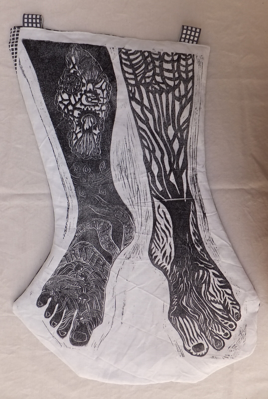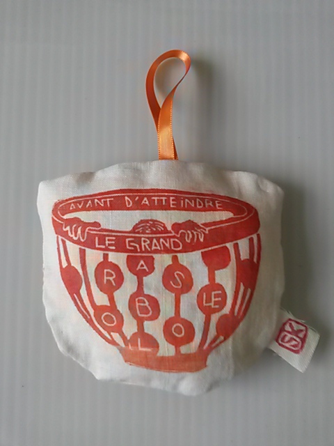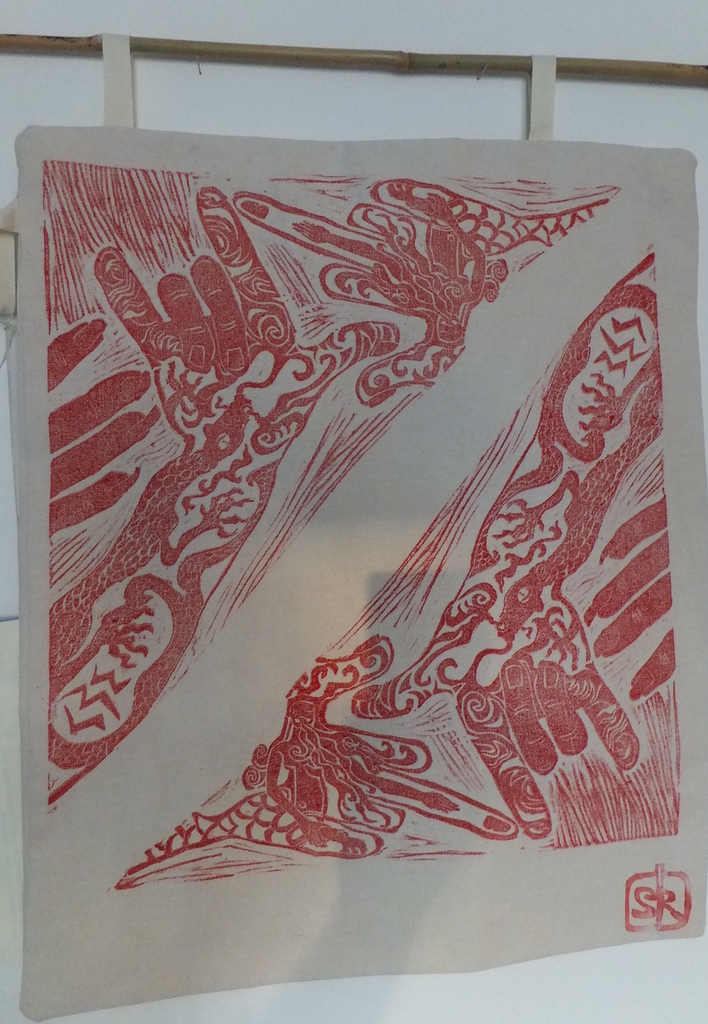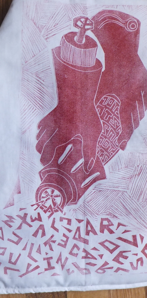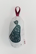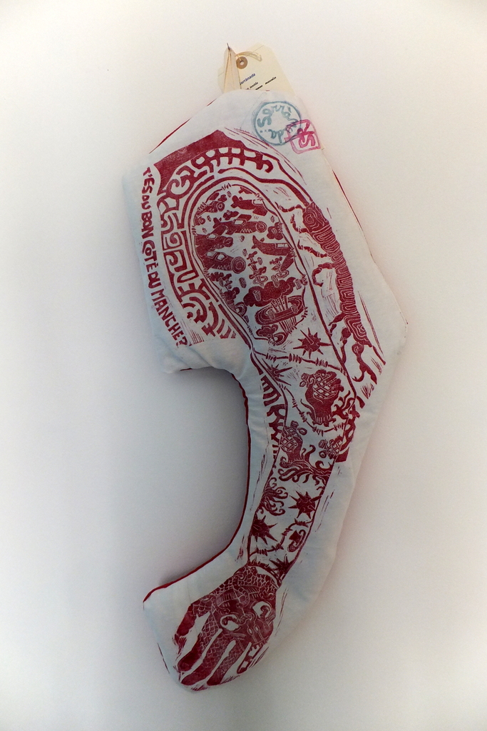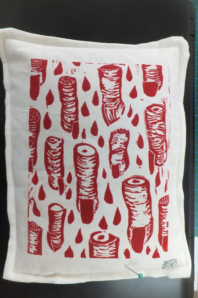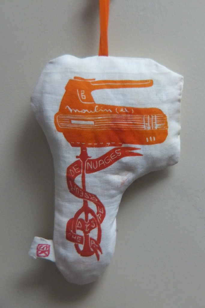 Je fabrique par linogravure, des estampes textiles, contournant la fragilité du papier, dans le but qu’elles circulent, soient mises en poche, transportées et accrochées dans les espaces de vie, privé et professionnel.