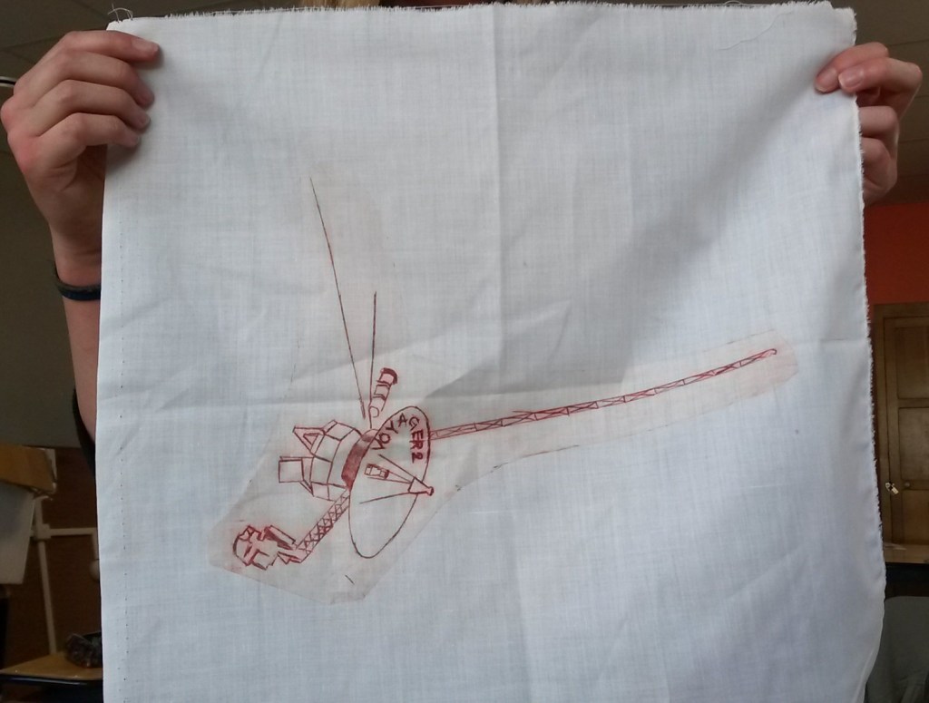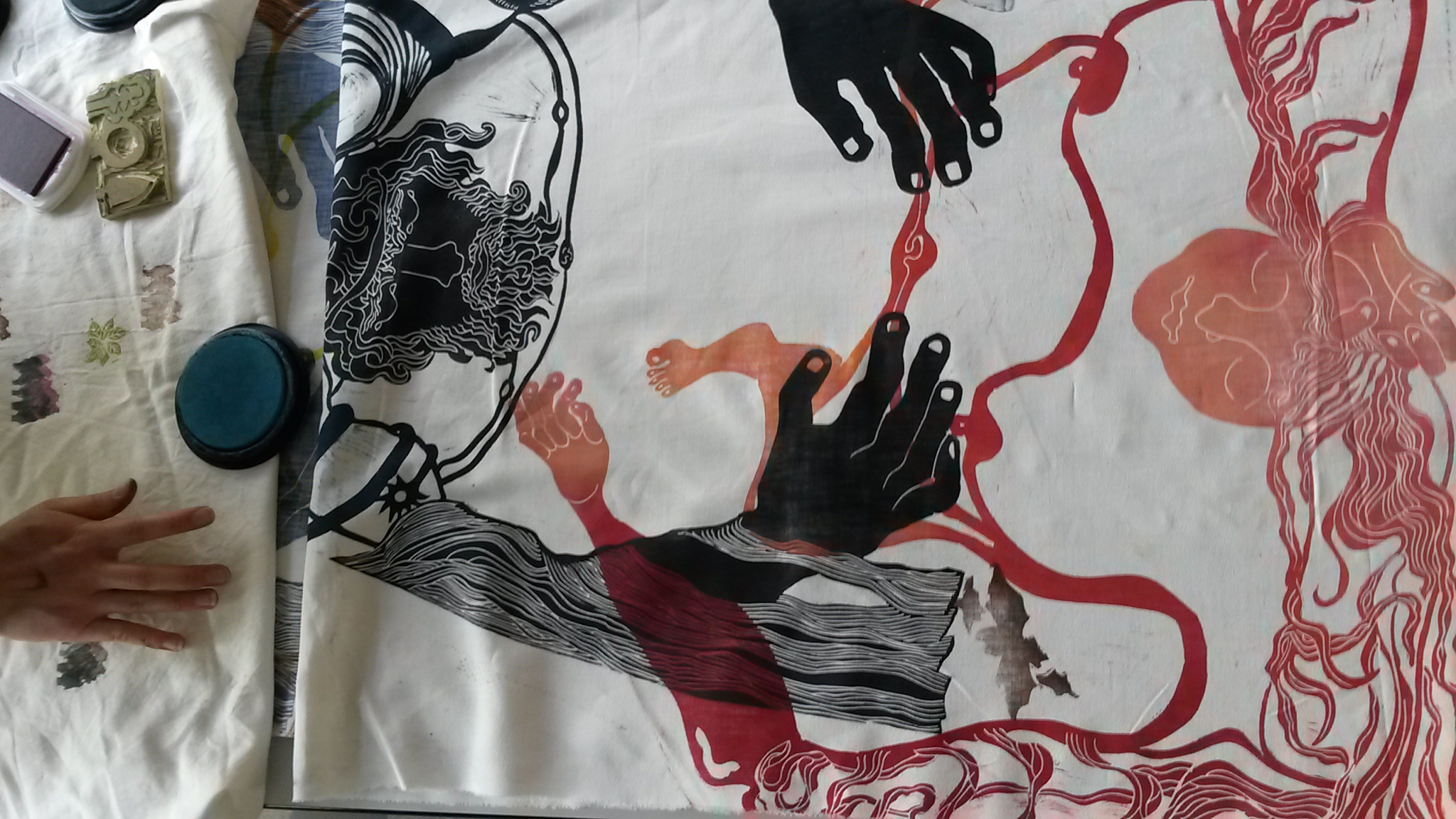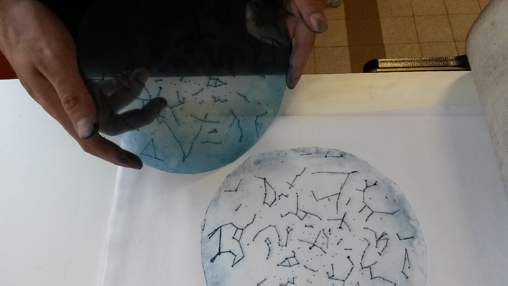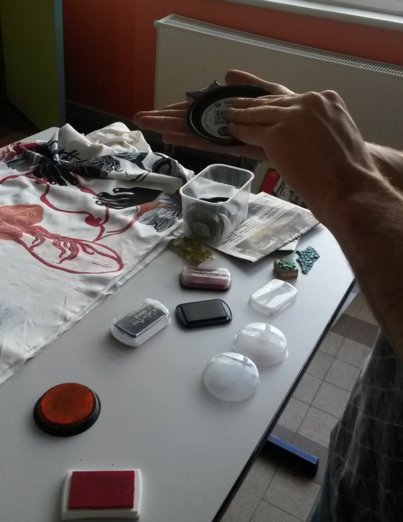 Nous avons mixé les différentes techniques de gravure (gomme, rhénalon, linogravure, polystyrène). Le kakemono, exposé plusieurs mois dans le jardin de la Fonderie, est aujourd’hui dans les locaux du lycée.