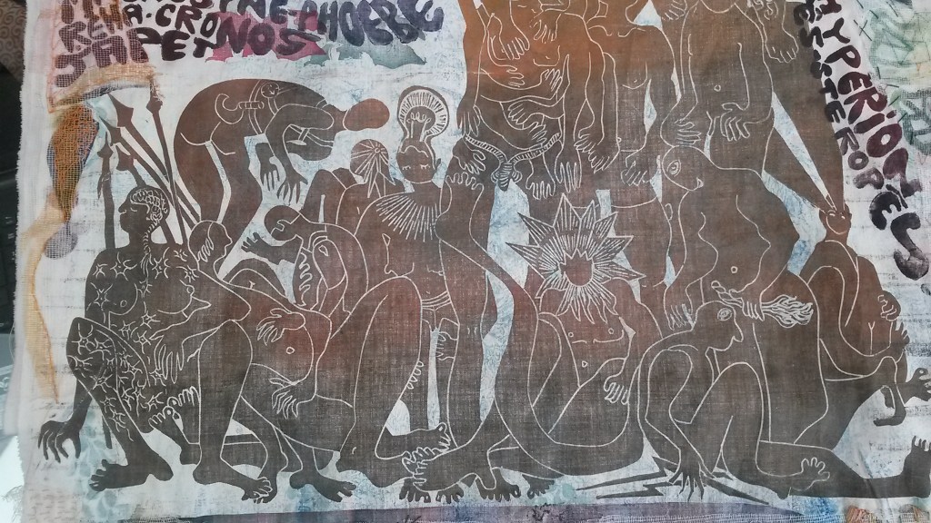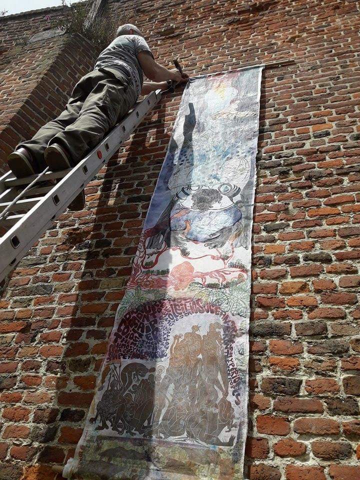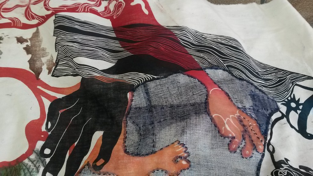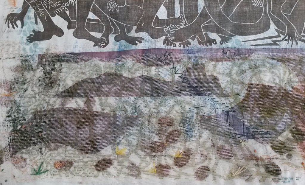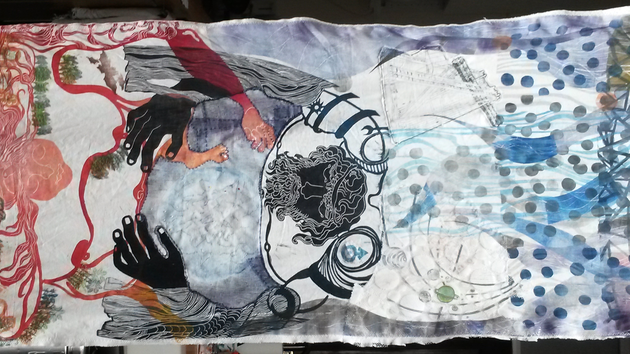 format du kakemono : 280 x 65 cm, impressions et coutures sur vieux drap coton.