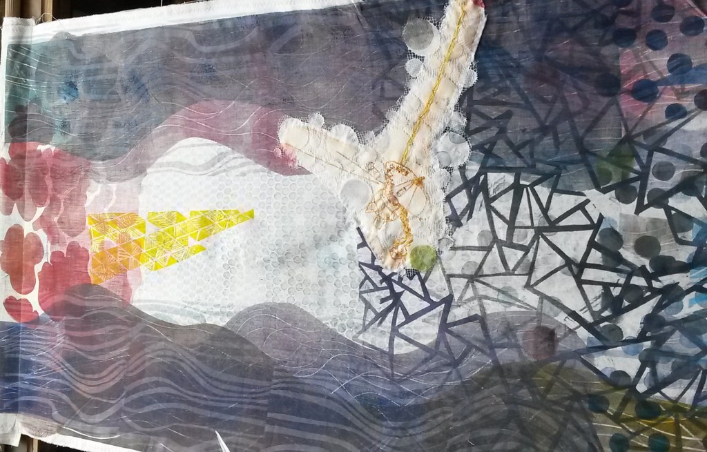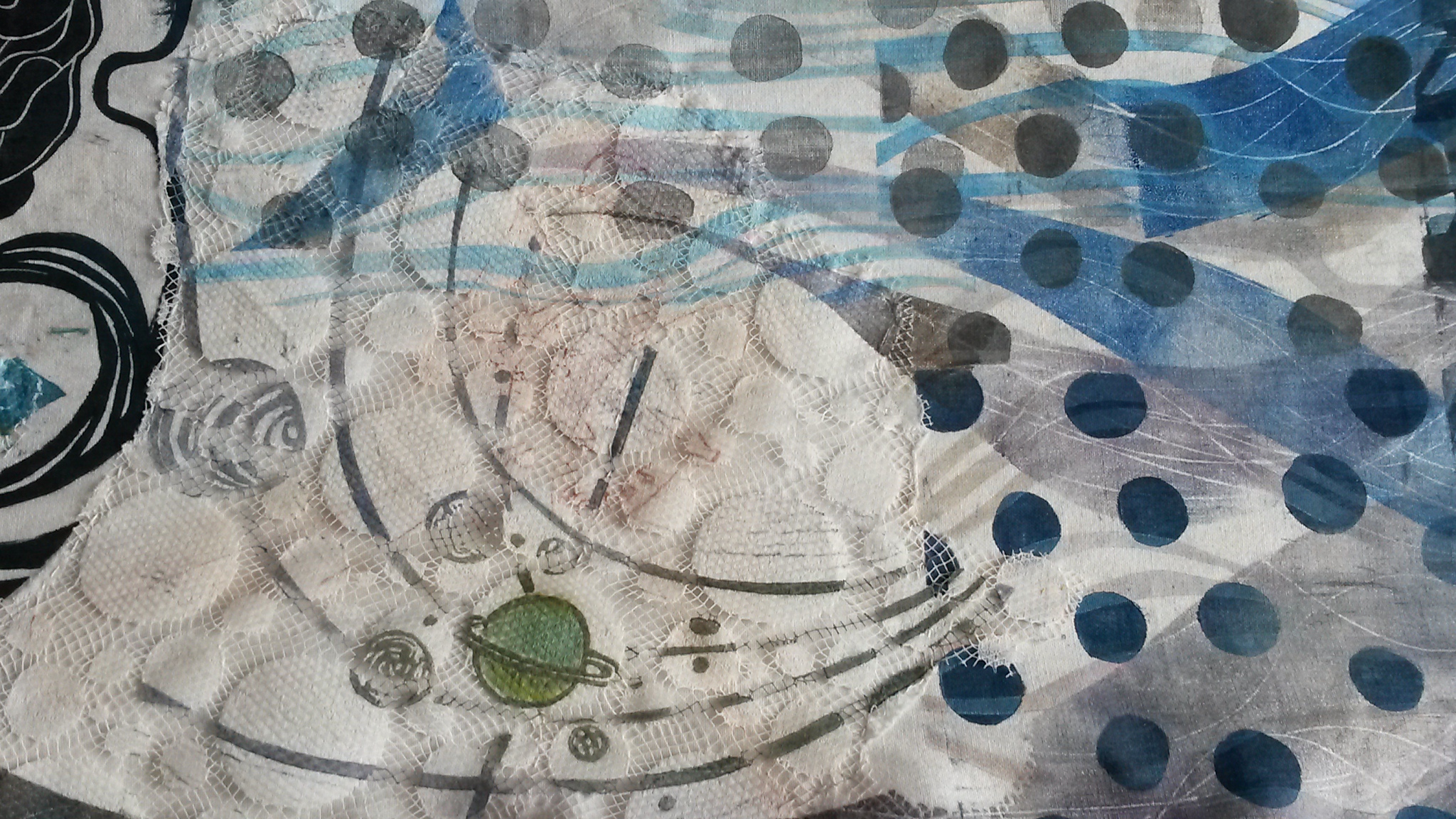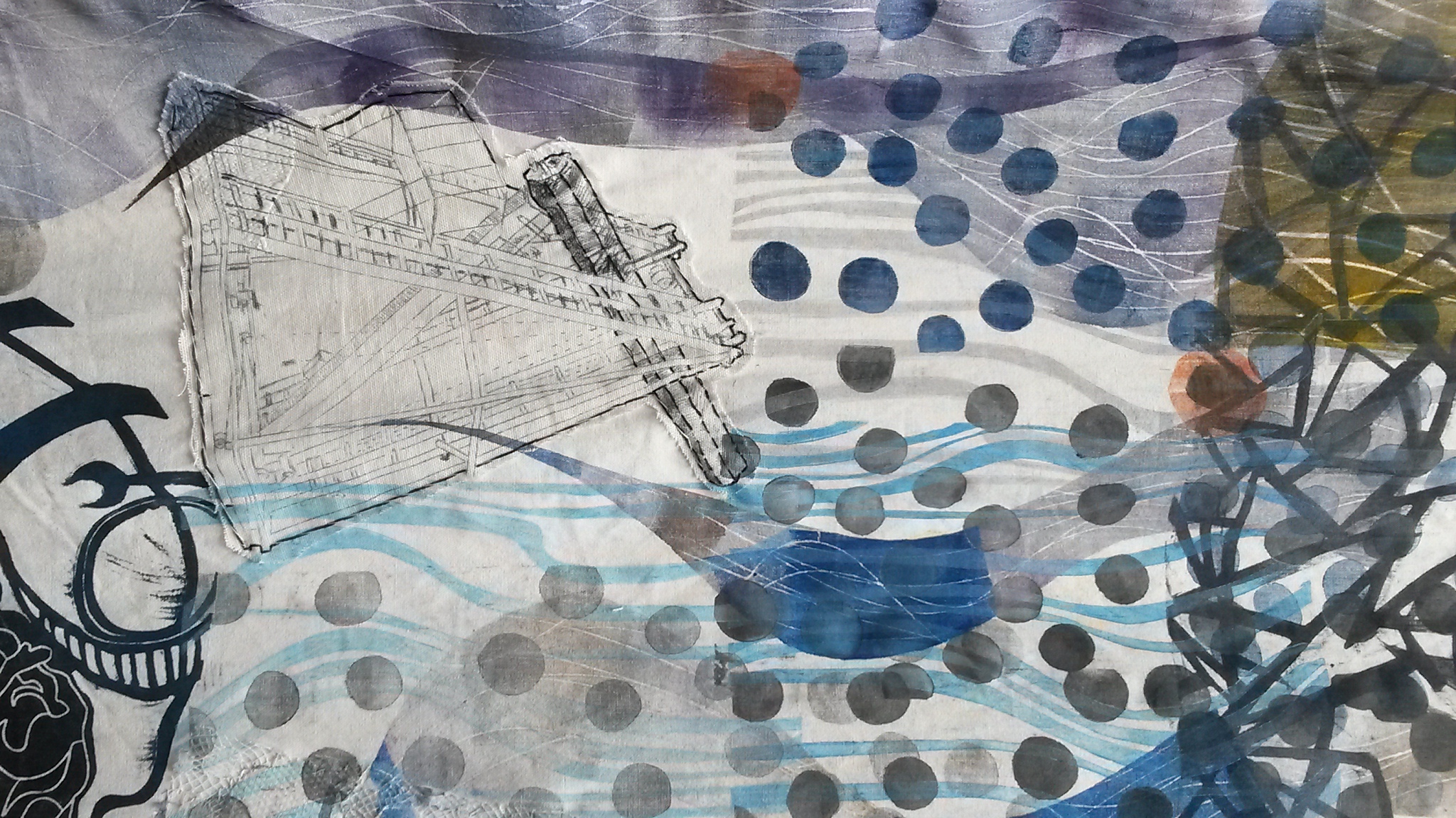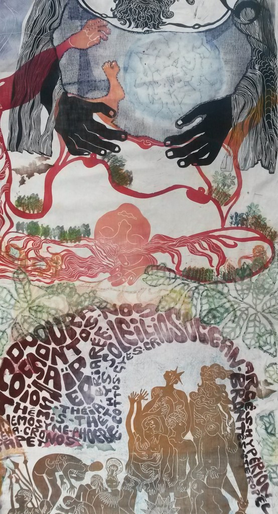 format du kakemono : 280 x 65 cm, impressions et coutures sur vieux drap coton.